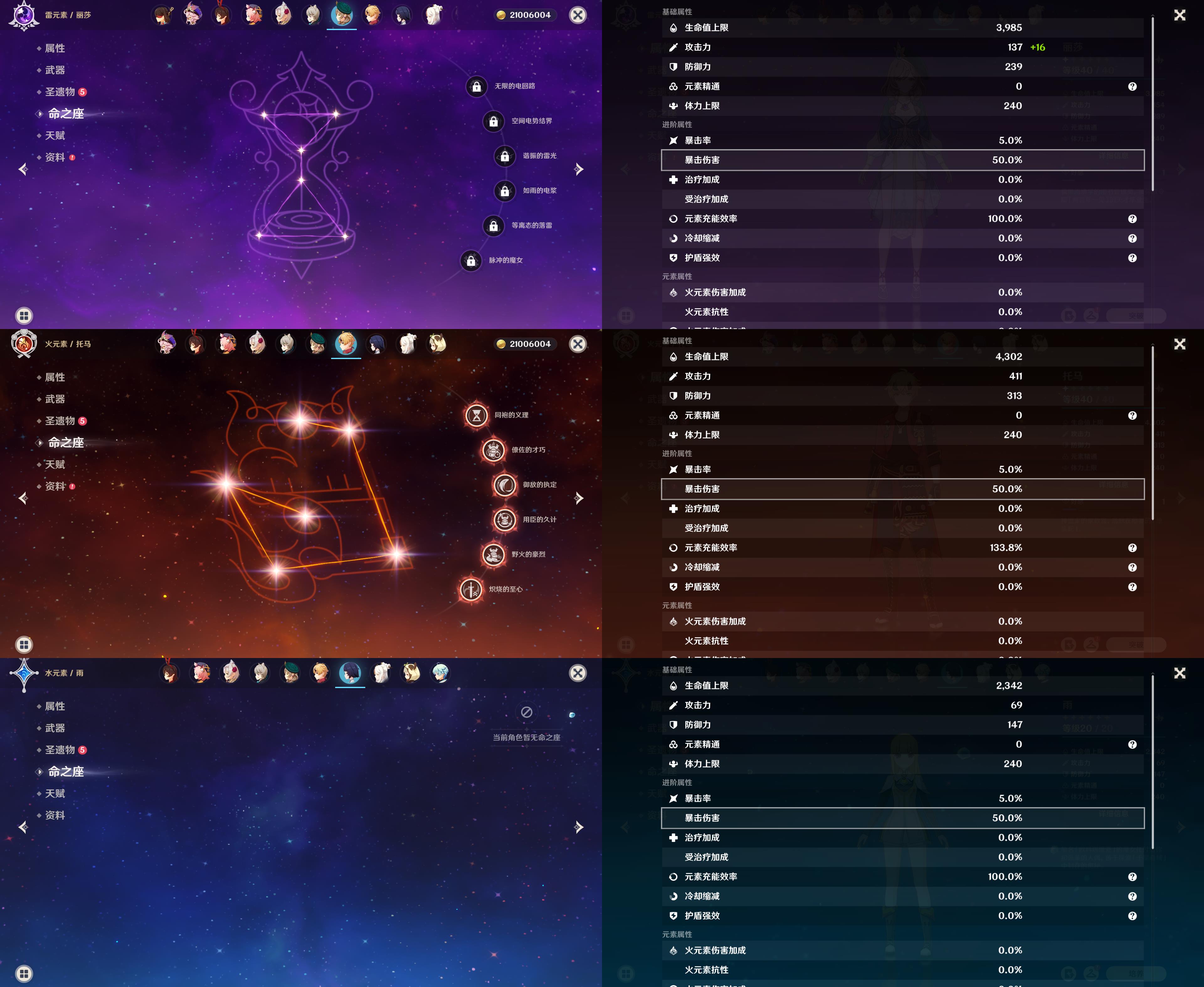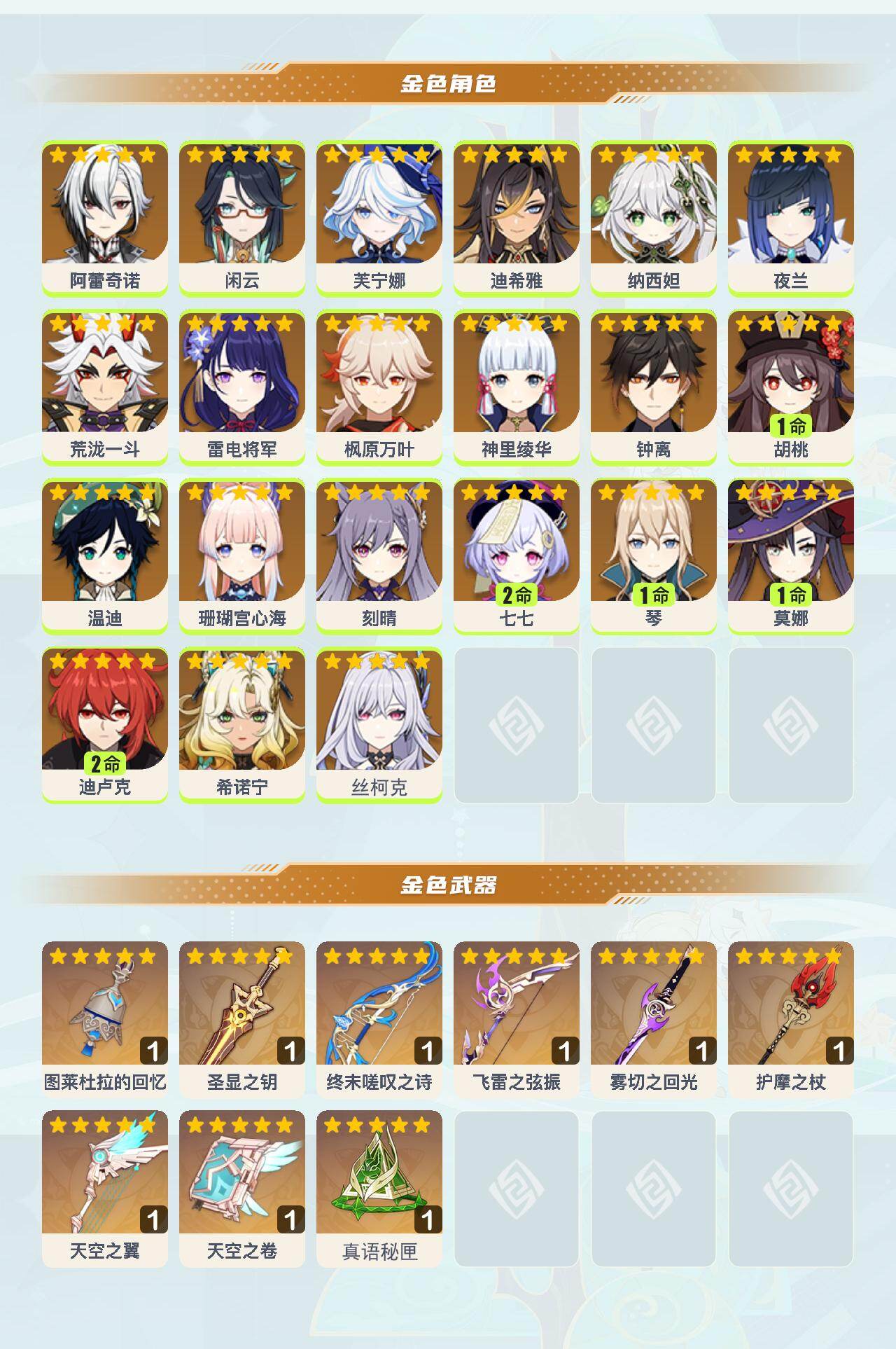 【YSYT841】60级/37黄/女主/21个五星角色/9个五星武器/神里绫华/枫原万叶/珊瑚宫心海/钟离/闲云/温迪/雷电将军/纳西妲/芙宁娜/阿蕾奇诺/1命胡桃/荒泷一斗/0命丝柯克/2命七七/刻晴/夜兰/希诺宁/1命琴/1命莫娜/2命迪卢克/迪希雅/图莱杜拉的回忆/护摩之杖/圣显之钥/雾切之回光/飞雷之弦振/终末嗟叹之诗/天空之翼/天空之卷/精1真语秘匣