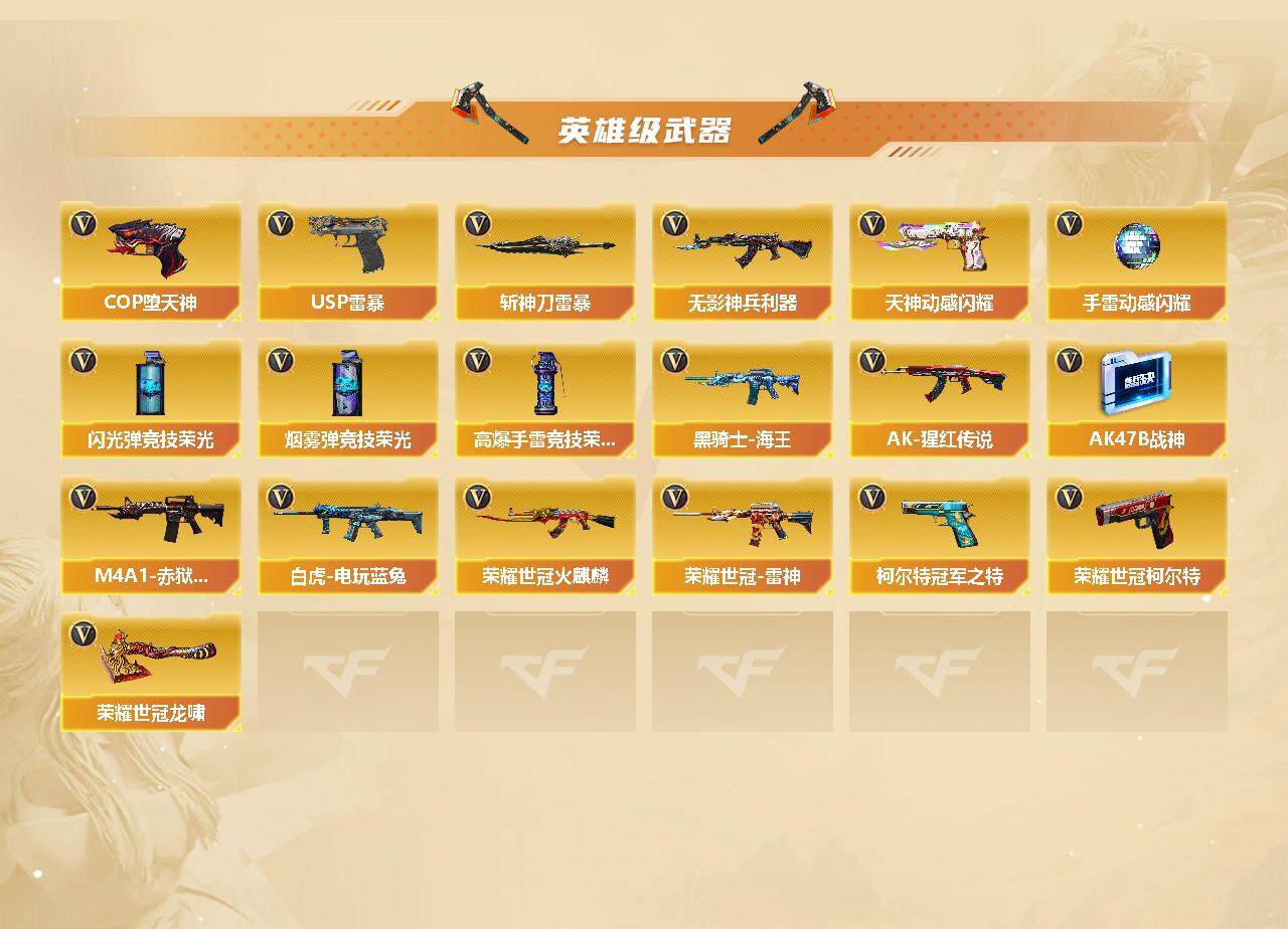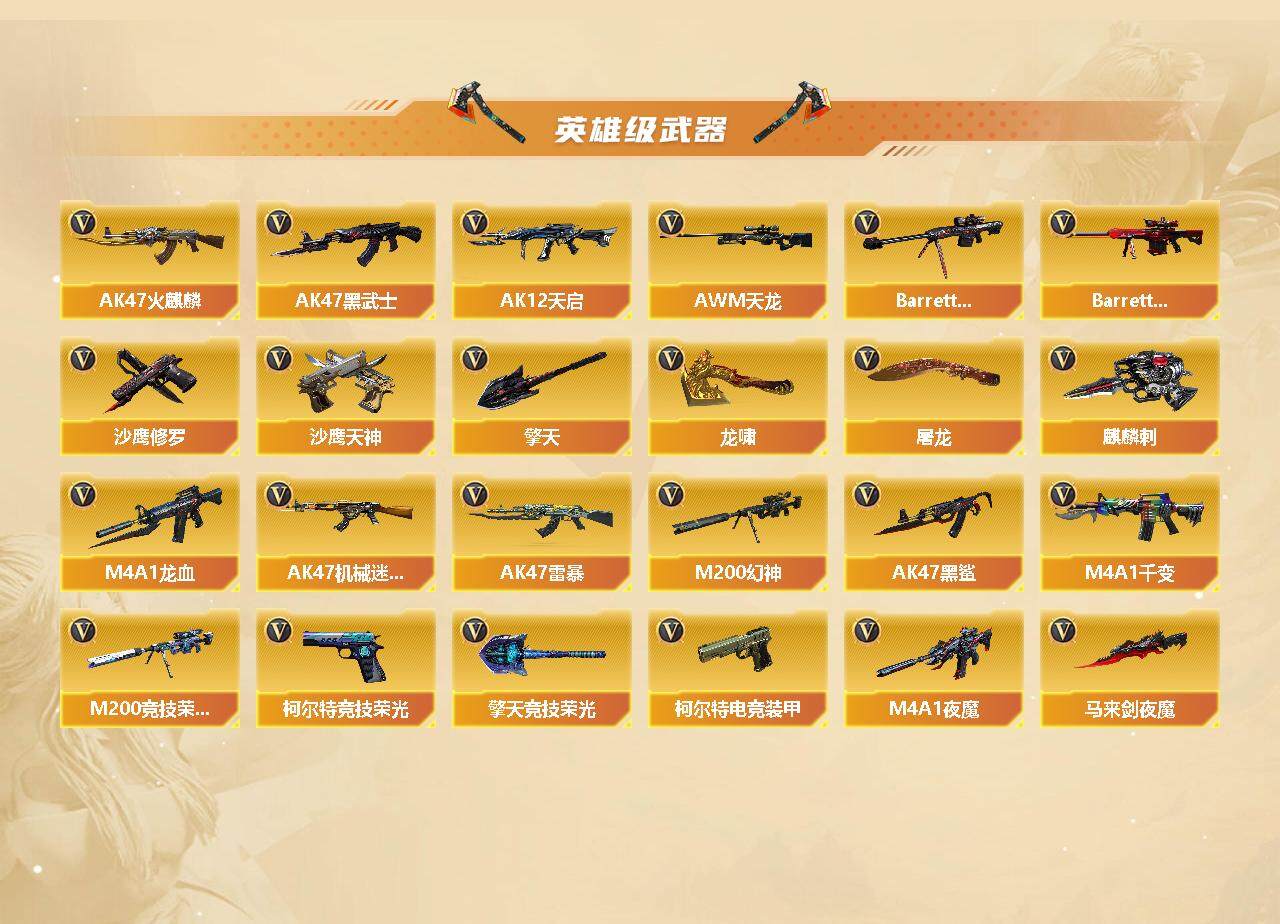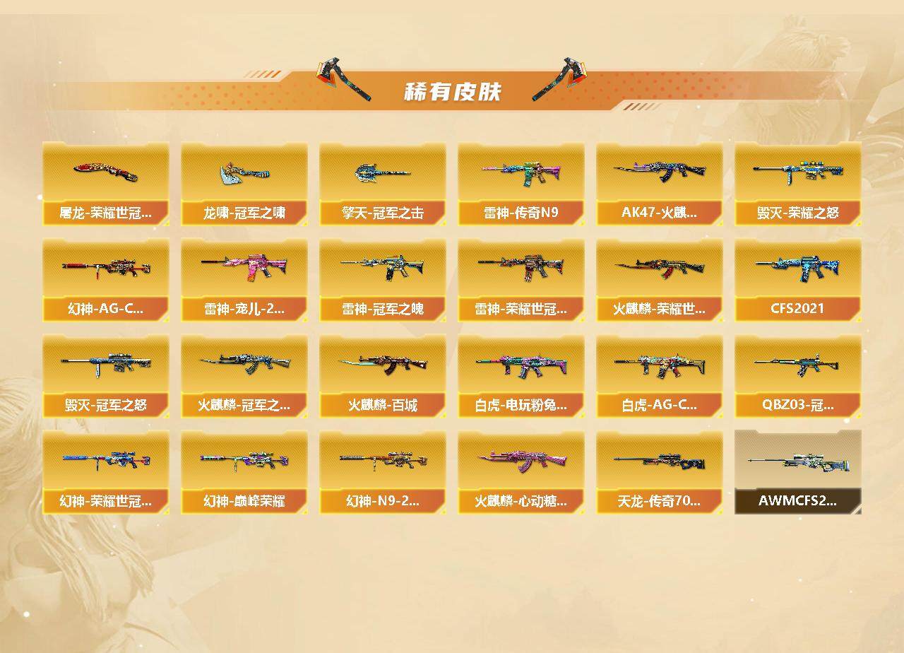 【热门武器】:传说辉光,QBZ03-金色蔷薇,Scar Light-白虎,M200-幻神*5,M200-竞技荣光,荣耀世冠-火麒麟,荣耀世冠-雷神,白虎-电玩蓝兔,柯尔特-冠军之特,荣耀世冠-柯尔特*2,C.A.T,牛牛-AK47,M4A1-黑骑士,汤姆逊-烈龙,加特林-炼狱,裁决-雪莉杨,火麒麟-绝迹,USP-雷暴,COP-堕天神,沙鹰-修罗*2,Knife-冠军之刃,荣耀世冠-龙啸