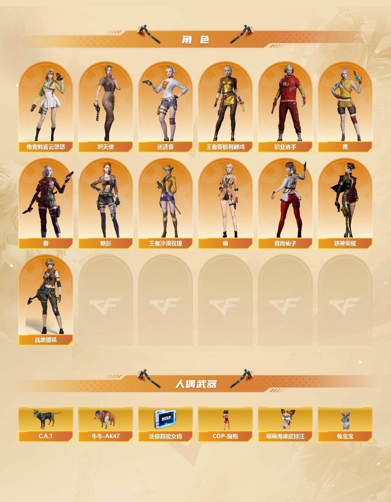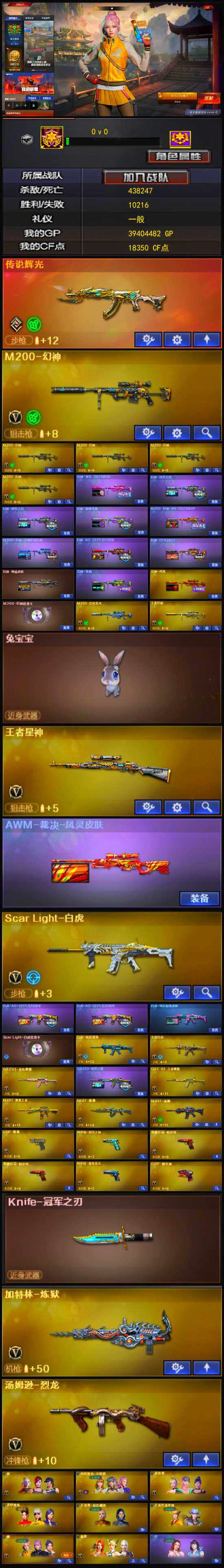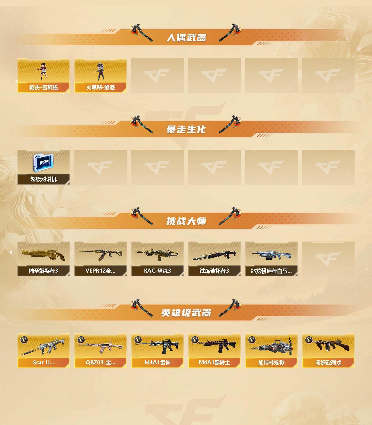 【热门武器】:传说辉光,QBZ03-金色蔷薇,Scar Light-白虎,M200-幻神*5,M200-竞技荣光,荣耀世冠-火麒麟,荣耀世冠-雷神,白虎-电玩蓝兔,柯尔特-冠军之特,荣耀世冠-柯尔特*2,C.A.T,牛牛-AK47,M4A1-黑骑士,汤姆逊-烈龙,加特林-炼狱,裁决-雪莉杨,火麒麟-绝迹,USP-雷暴,COP-堕天神,沙鹰-修罗*2,Knife-冠军之刃,荣耀世冠-龙啸