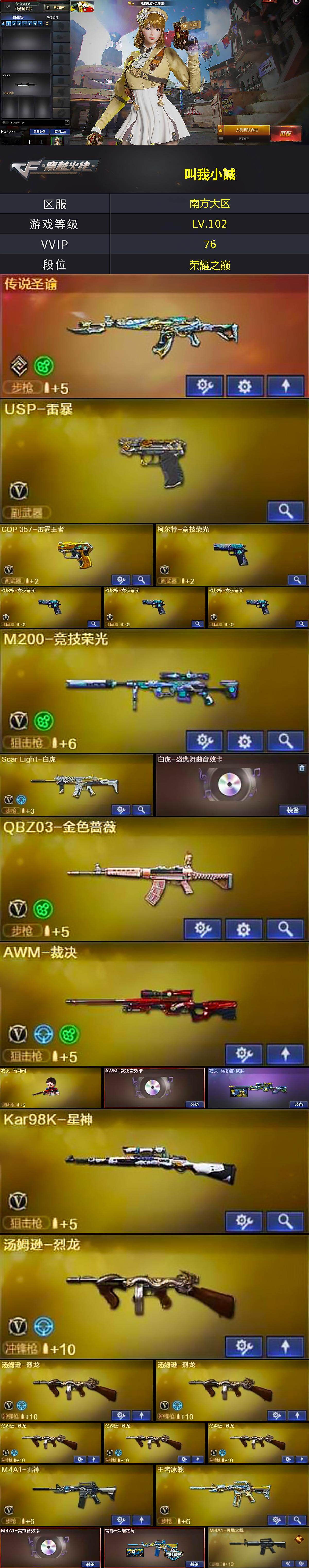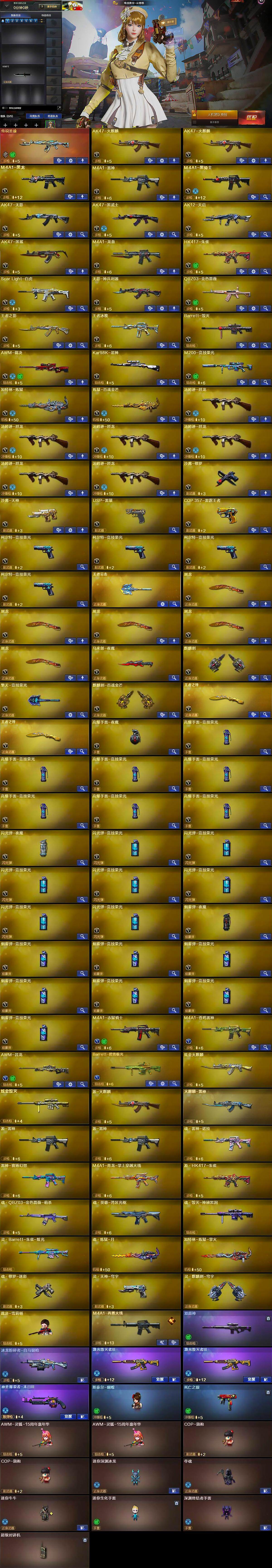 【热门武器】:传说圣谕,QBZ03-金色蔷薇,Scar Light-白虎,HK417-朱雀,M200-竞技荣光,死亡之眼,Kar98K-星神,金色小号,M4A1-黑骑士,汤姆逊-烈龙*6,加特林-炼狱,斯泰尔-蝴蝶,羊驼玩偶,裁决-雪莉杨,USP-雷暴,沙鹰-修罗,金刚伞*2
