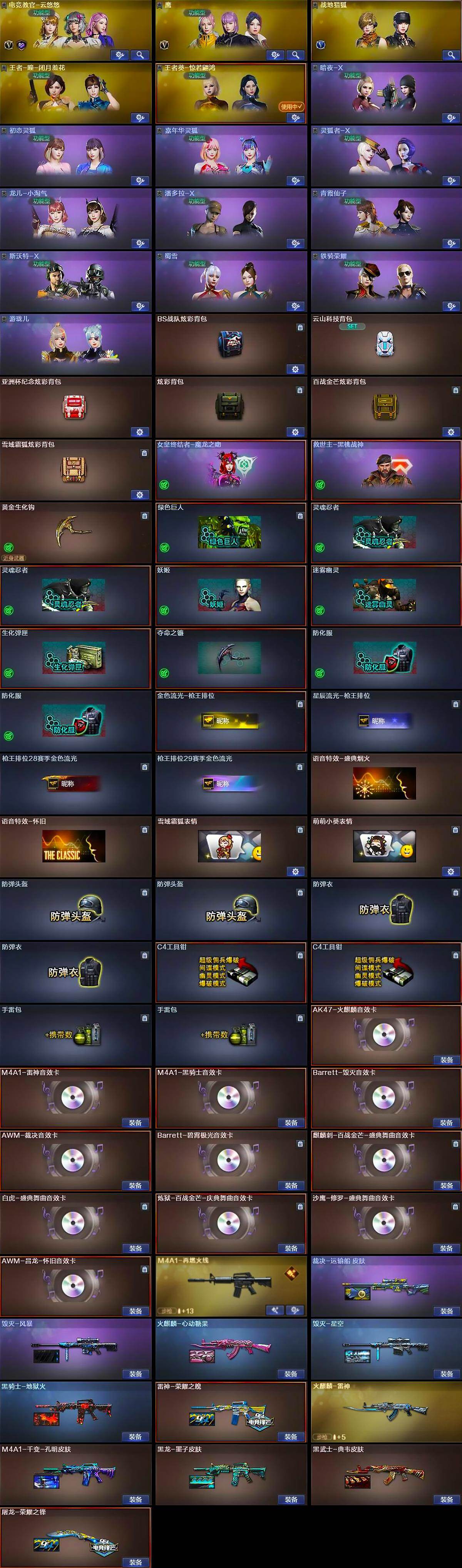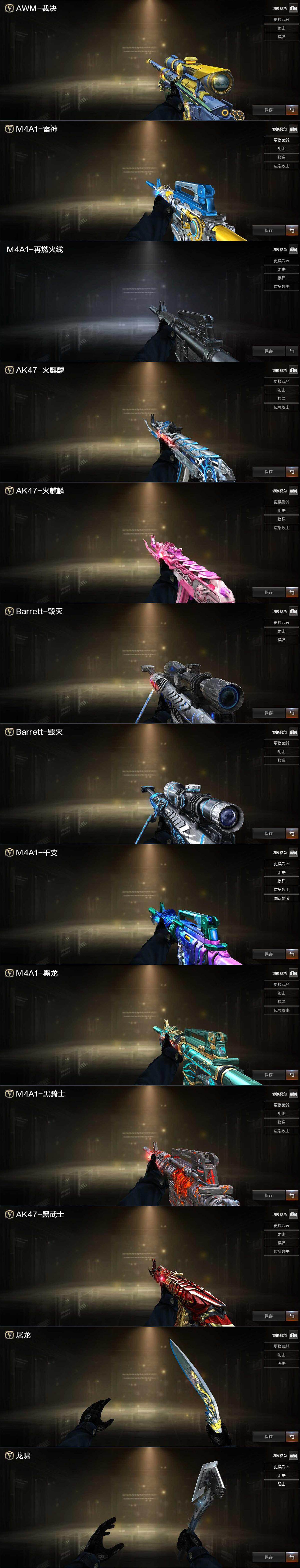 【音效卡】:AK47-火麒麟音效卡,M4A1-雷神音效卡,M4A1-黑骑士音效卡,Barrett-毁灭音效卡,AW