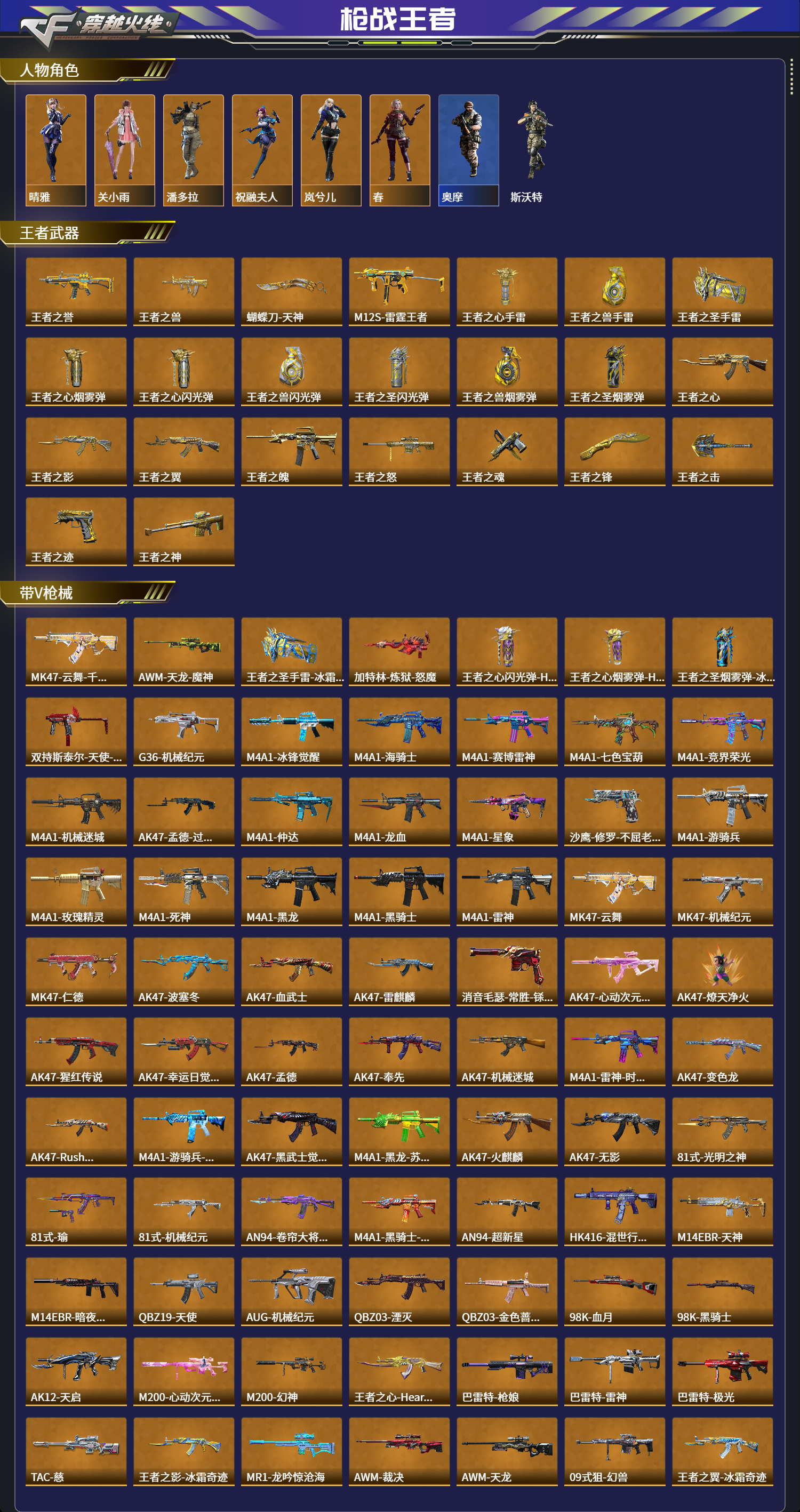 【王者武器】王者之誉,王者之兽,蝴蝶刀-天神,M12S-雷霆王者,王者之心手雷,王者之兽手雷,王者之圣手雷,王者之圣手雷,王者之心烟雾弹,王者之心闪光弹,王者之兽闪光弹,王者之圣闪光弹,王者之圣闪光弹,王者之兽烟雾弹,王