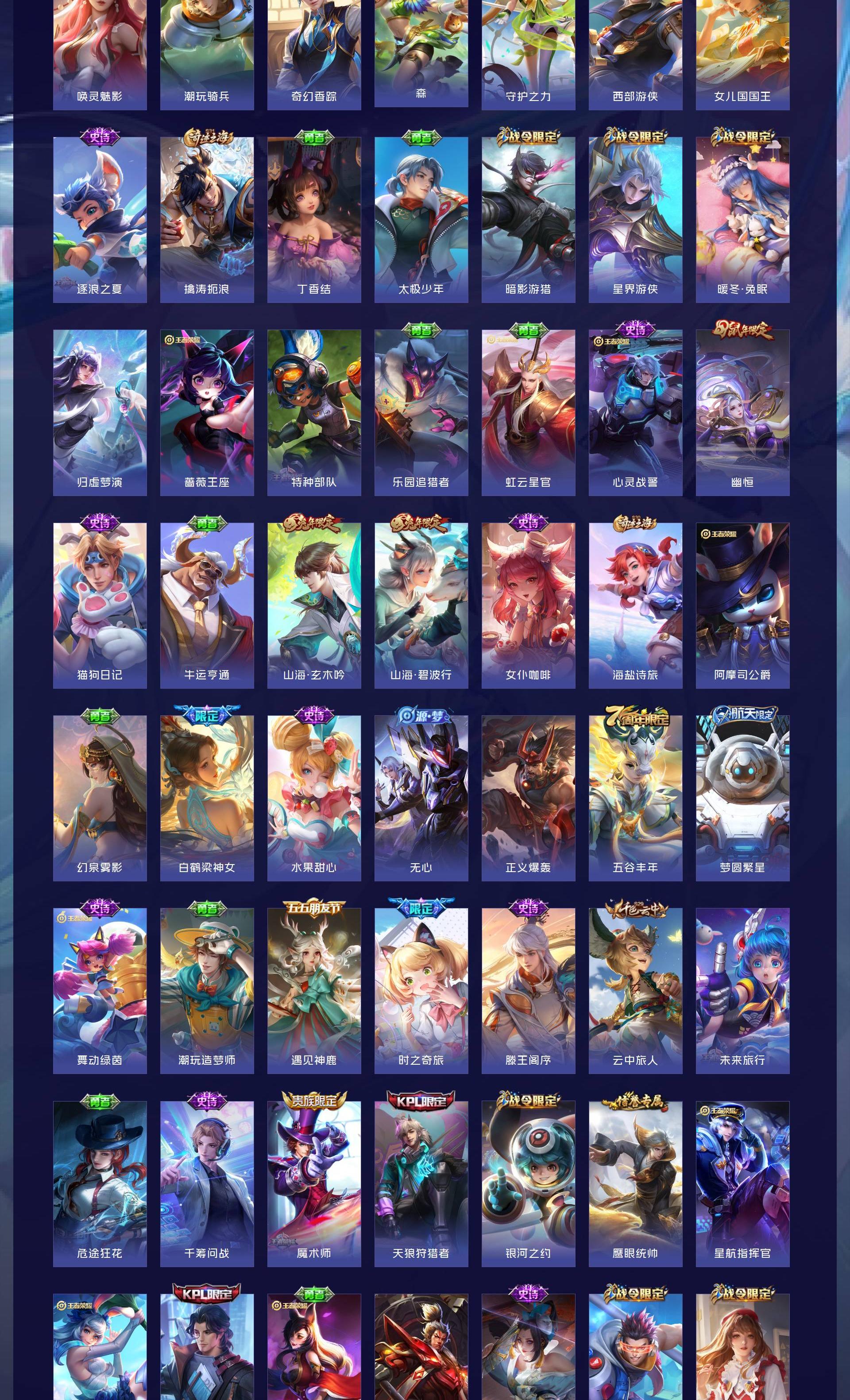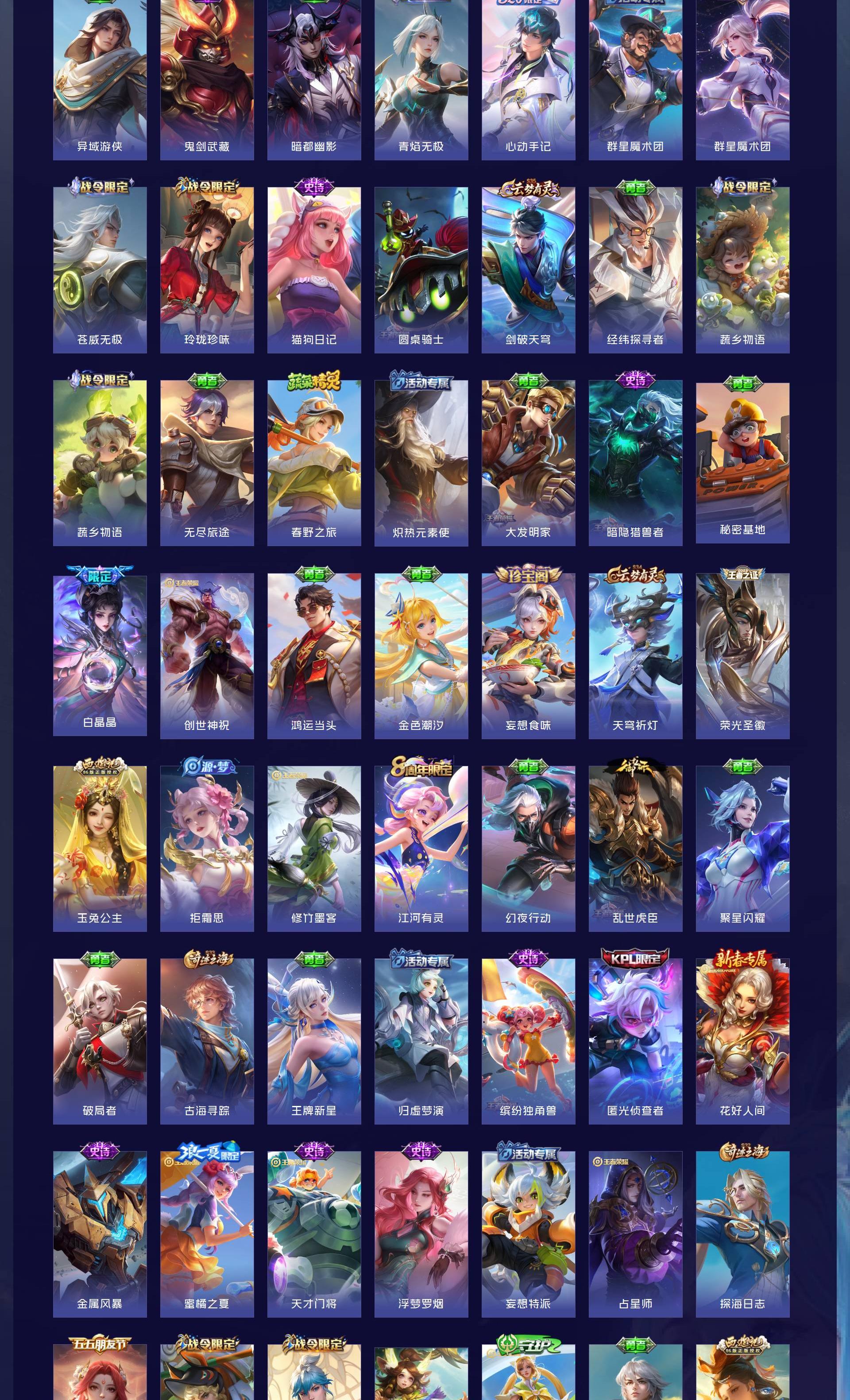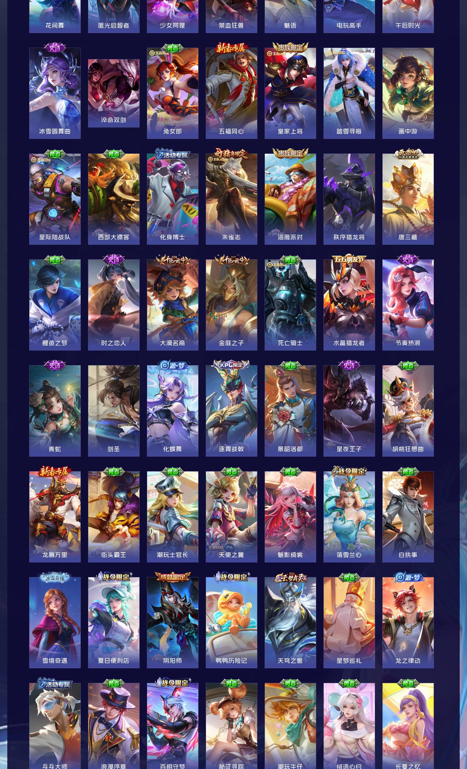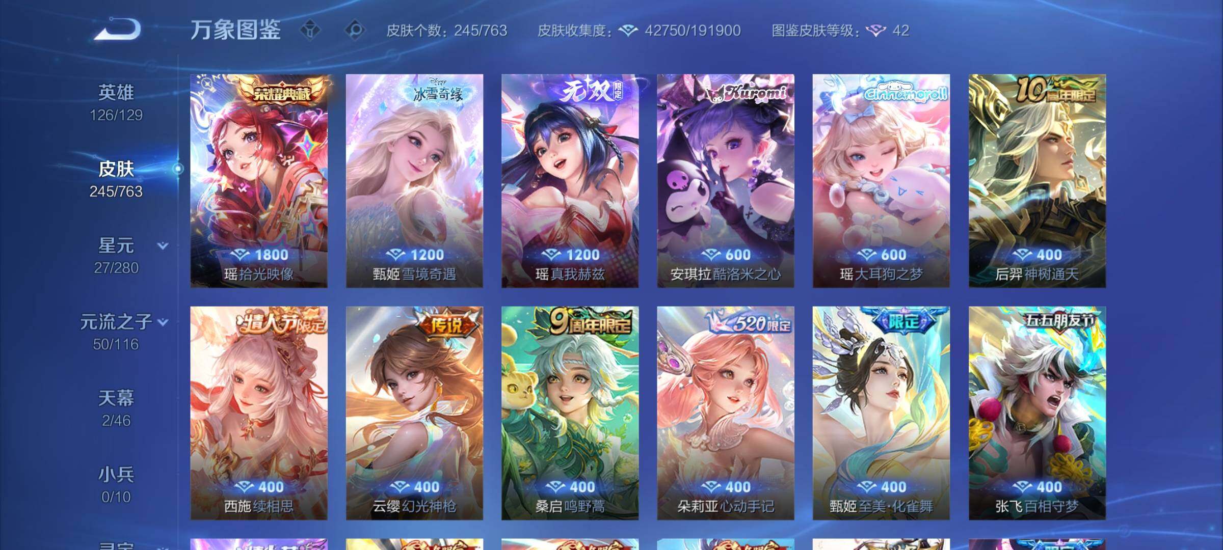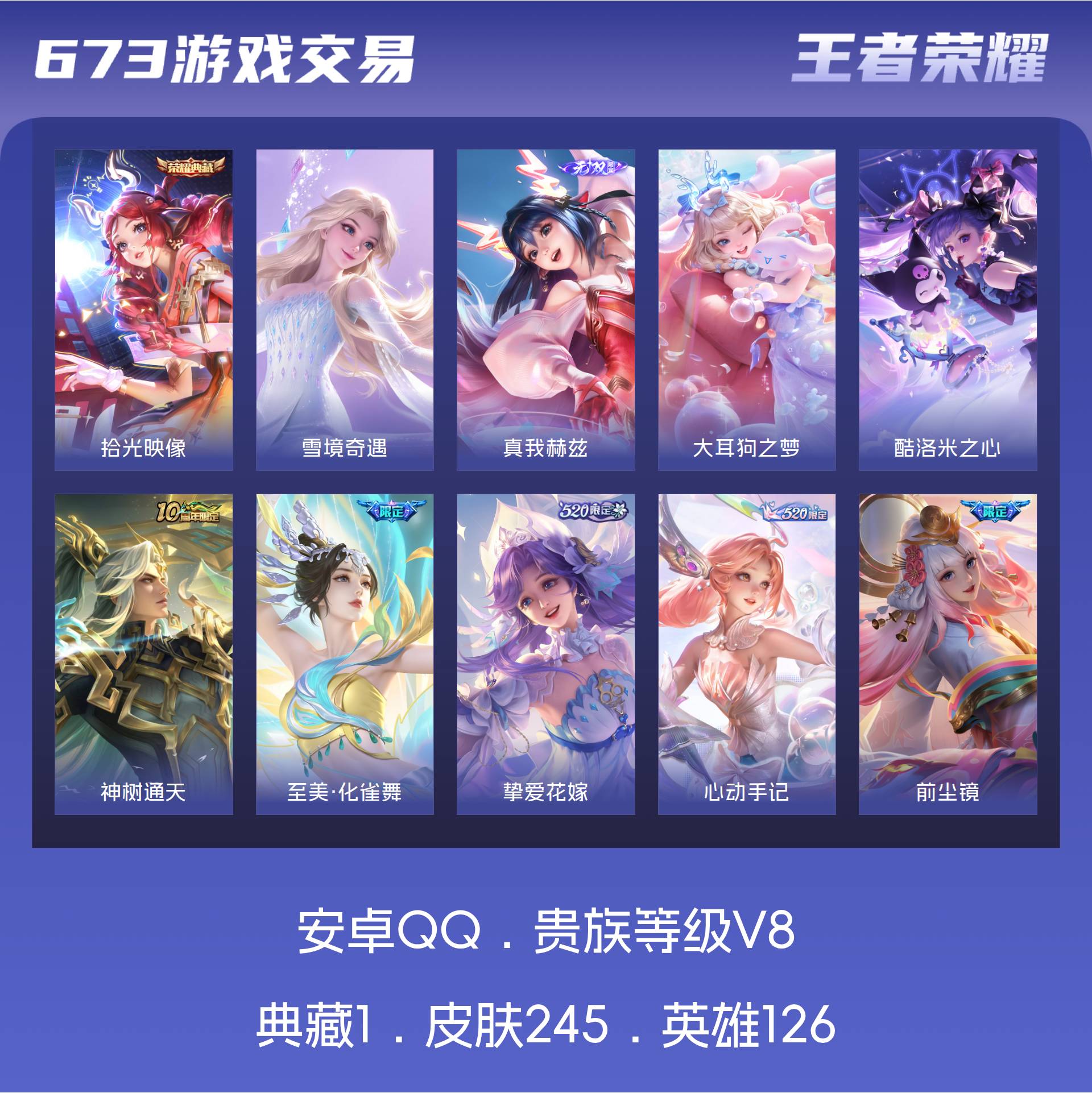 V8 皮肤245 英雄126 永恒钻石 荣耀典藏1 无双皮肤2 珍品传说2 传说23 其他皮肤222