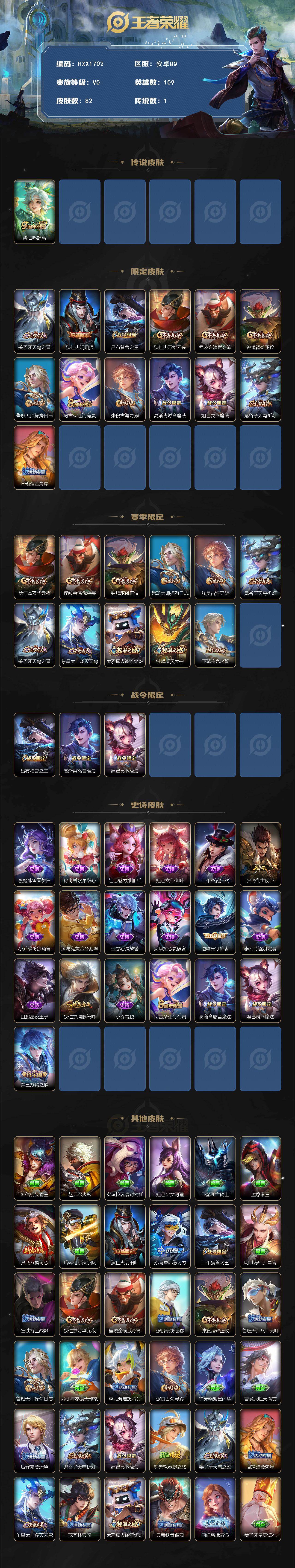 【HXX1702】贵族0/皮肤82/传说1/史诗18/英雄109/桑启-鸣野蒿