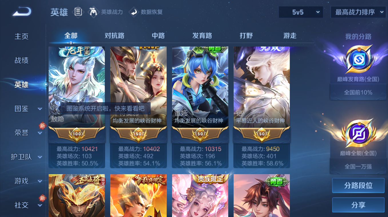 【精品号手慢无】可换绑手机号 性价比v10号 6万战金标九千四金标凯 全国前百分之十巅峰发育路玩过万强巅峰全能 94级收藏家 7典藏皮 无双皮凯神罪 48优质传说艾琳觅芳踪典藏遇见胡璇曜李逍遥伽罗太华百里玄策白虎志等 288534贵族积分 6星传说 11个性按键。