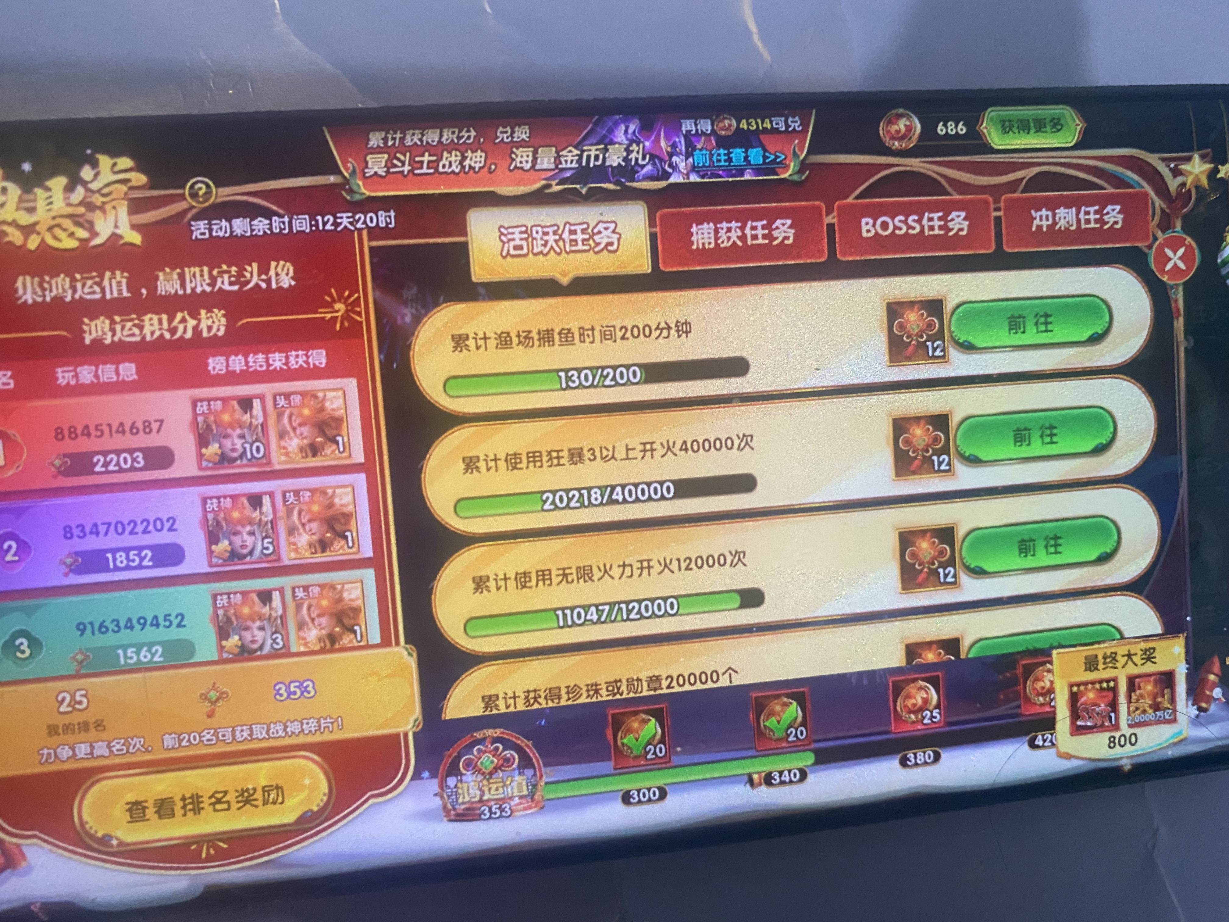 带号出,战神334,西游33,机甲322,多战神出战。200炮,巅峰32。v4加成非常不错了,刚充的战令。适合玩家带9兆。春节没换来砍