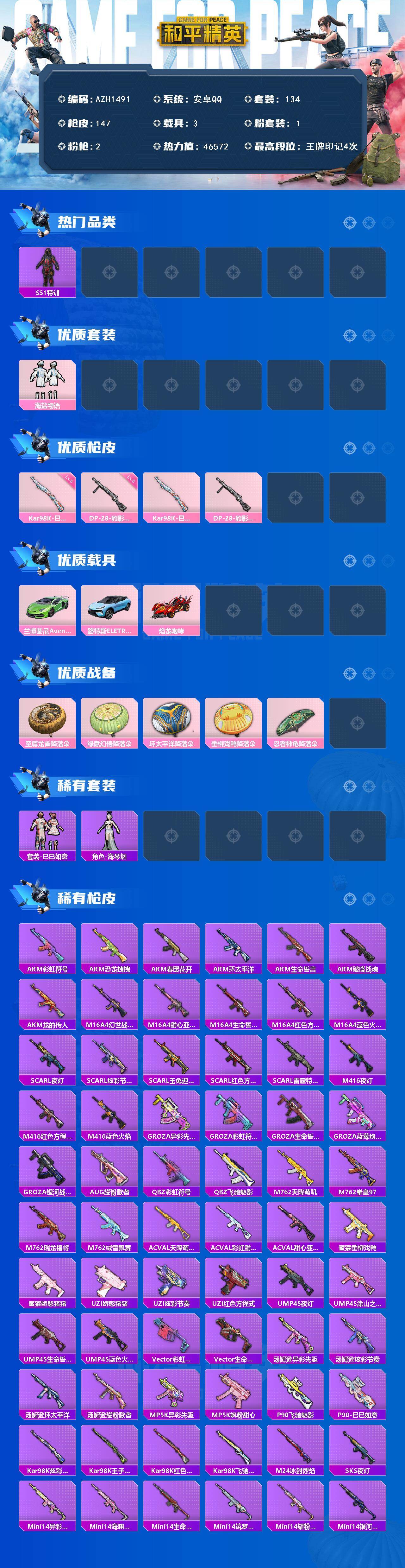 【AZH1491】安卓 手Q【海盐物语 俏皮奶喵 3载具】1粉装-2特效枪-3载具-0粉色飞行器-46572热力值-4王牌印记-134套装-147枪皮