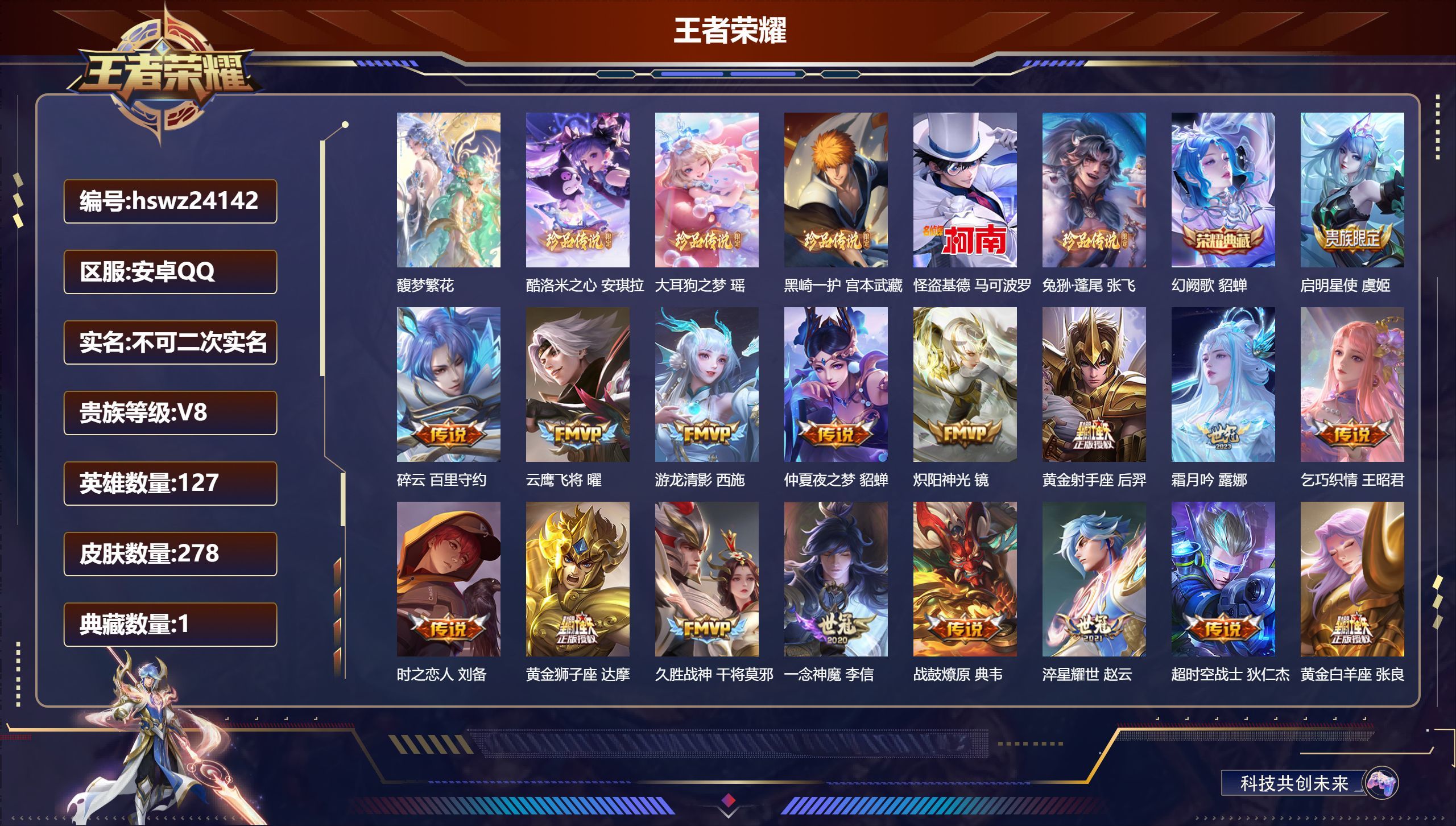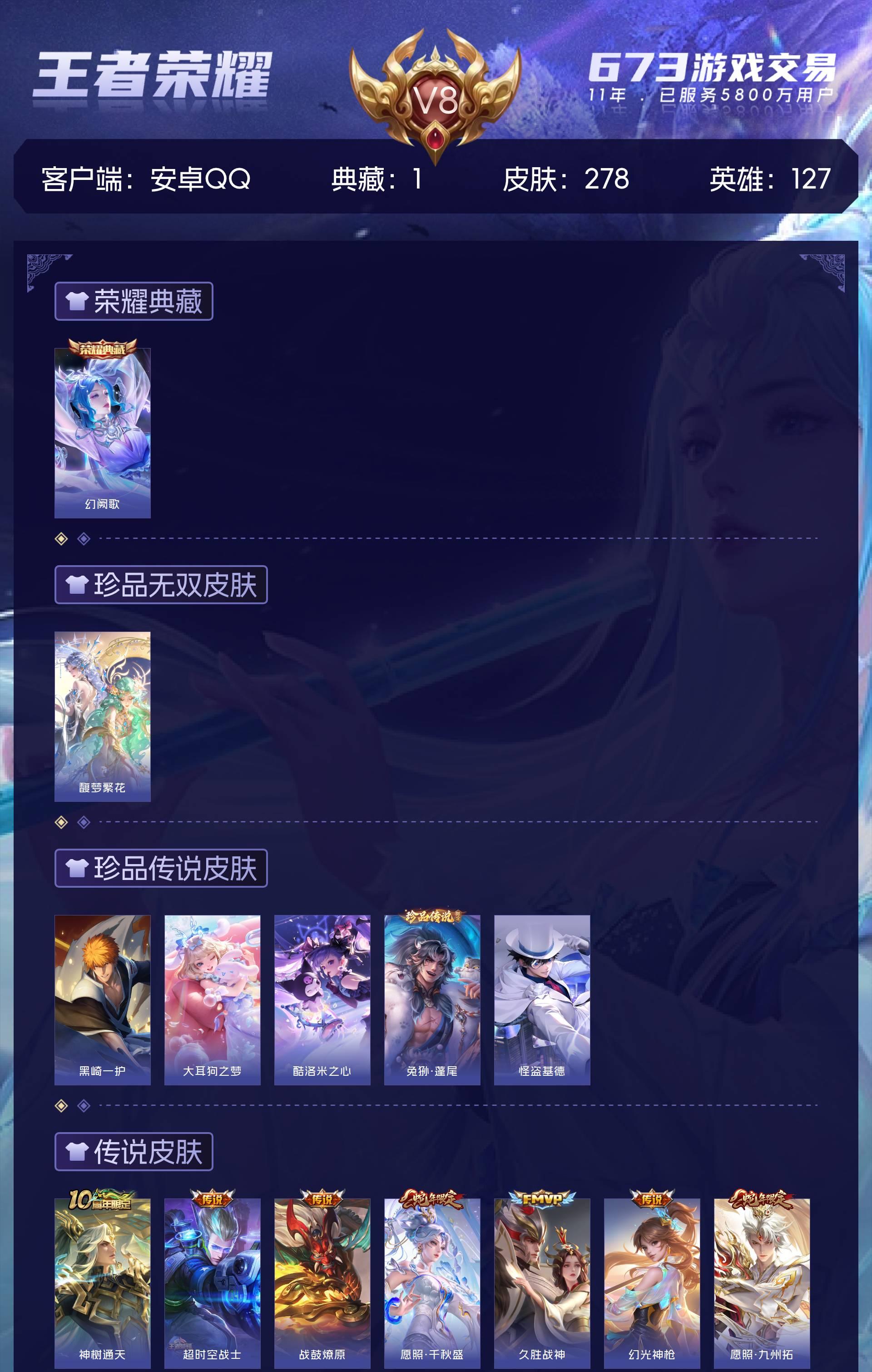 安卓QQ/至尊星耀/278皮肤/127英雄/1典藏/1珍品无双/0无双/5珍品传说/24传说/74史