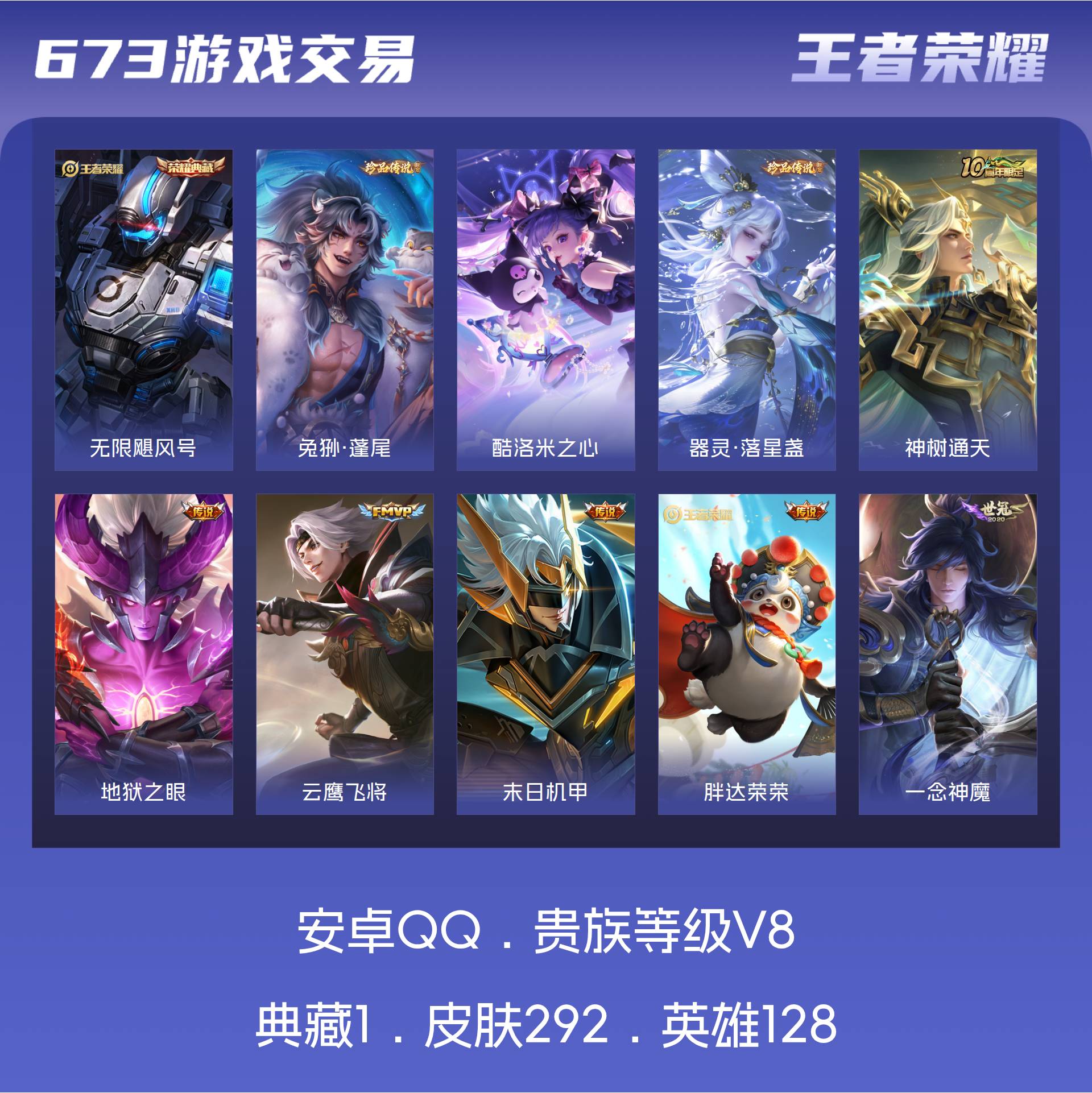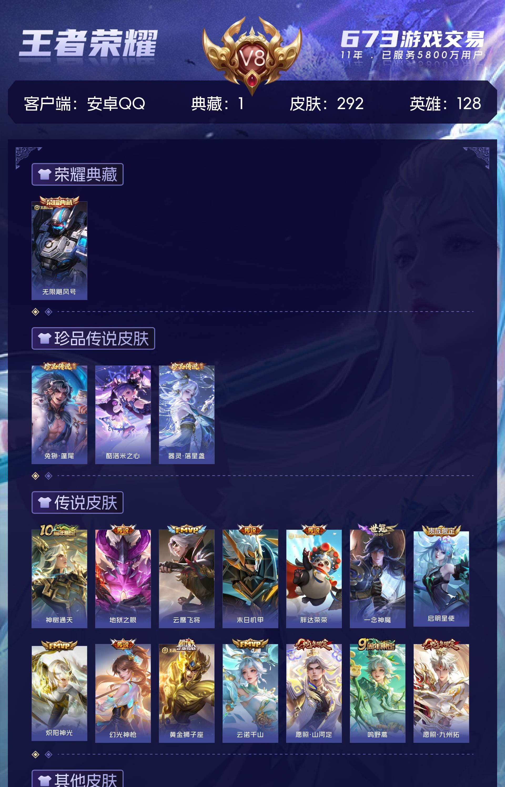 安卓QQ/至尊星耀/292皮肤/128英雄/1典藏/0珍品无双/0无双/3珍品传说/15传说/83史