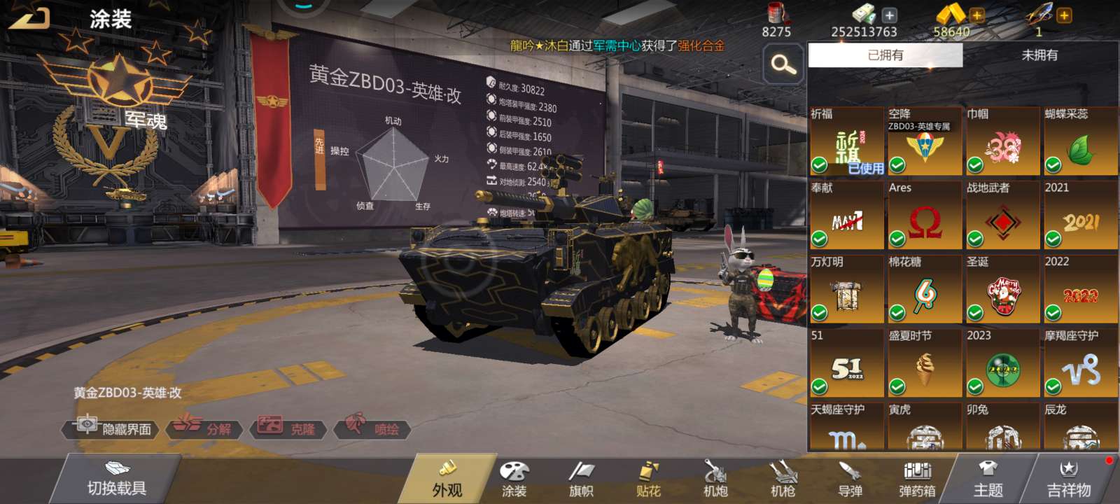 黄金03,黄金悍马,近Sam,Vt5,军神涂装+金牛贺岁。59顶图加107红钻 。