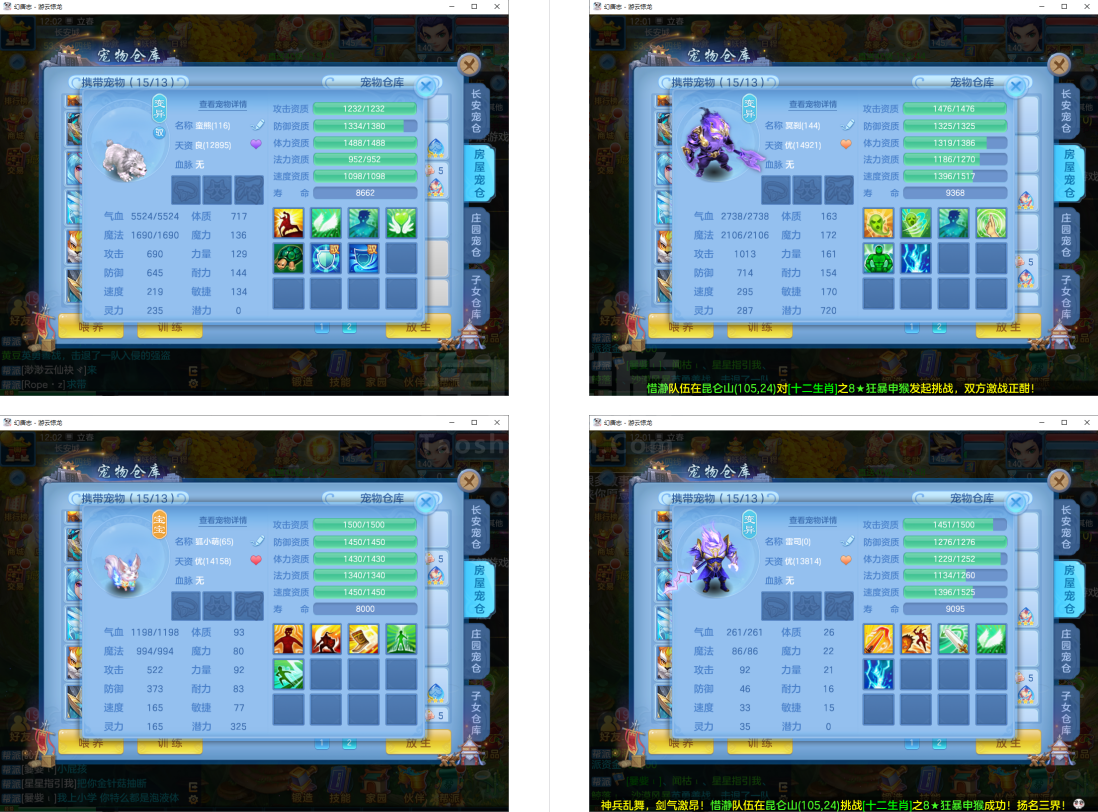 2件13段2件12段2件11段,易成长,满魂仙兽(带仙皮)+内丹神兽蛇+12个6多特殊5(总9满魂兽),14红13专属血脉,12个宝宝皮肤,高级坐骑+金拍庄园,3656成就
