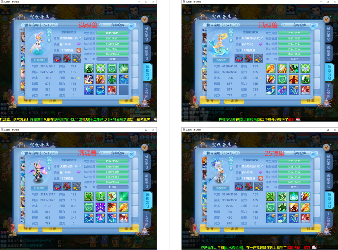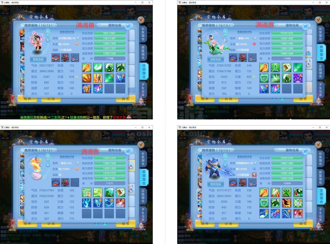 满魂仙兽(带仙皮)+内丹神兽蛇+12个6多特殊5(总9满魂兽),14红13专属血脉,12个宝宝皮肤