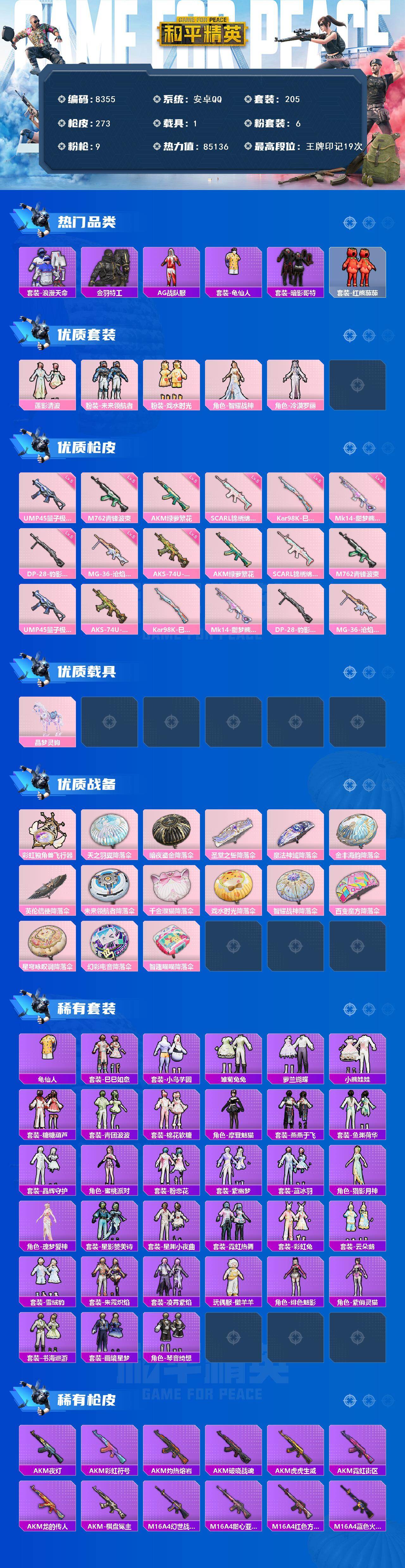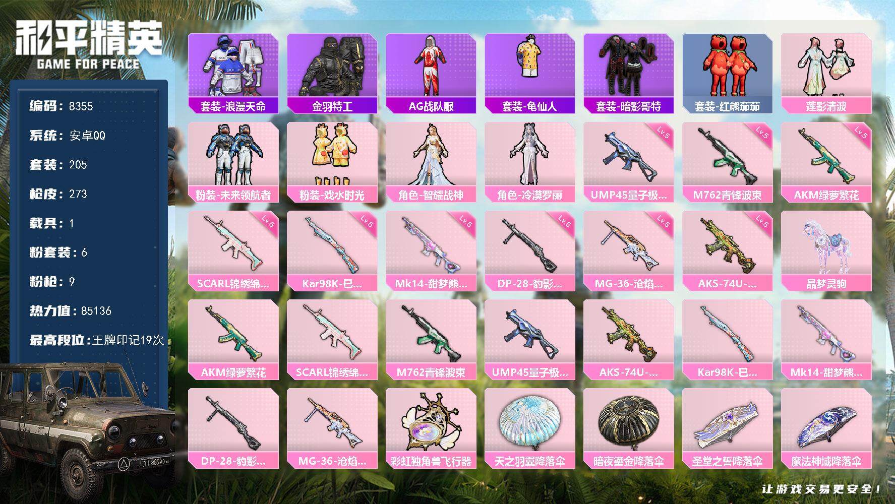 【8355】6粉装-9特效枪-1载具-2粉色飞行器-85136热力值-19王牌印记-205套装-273枪皮
