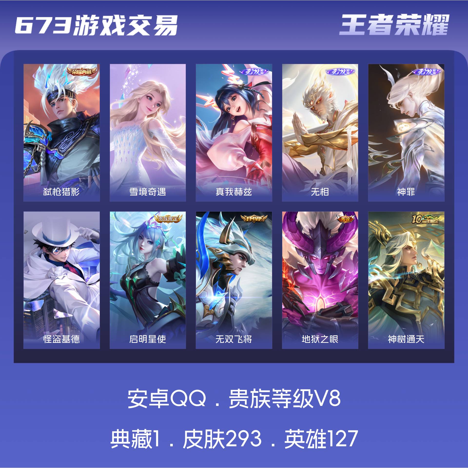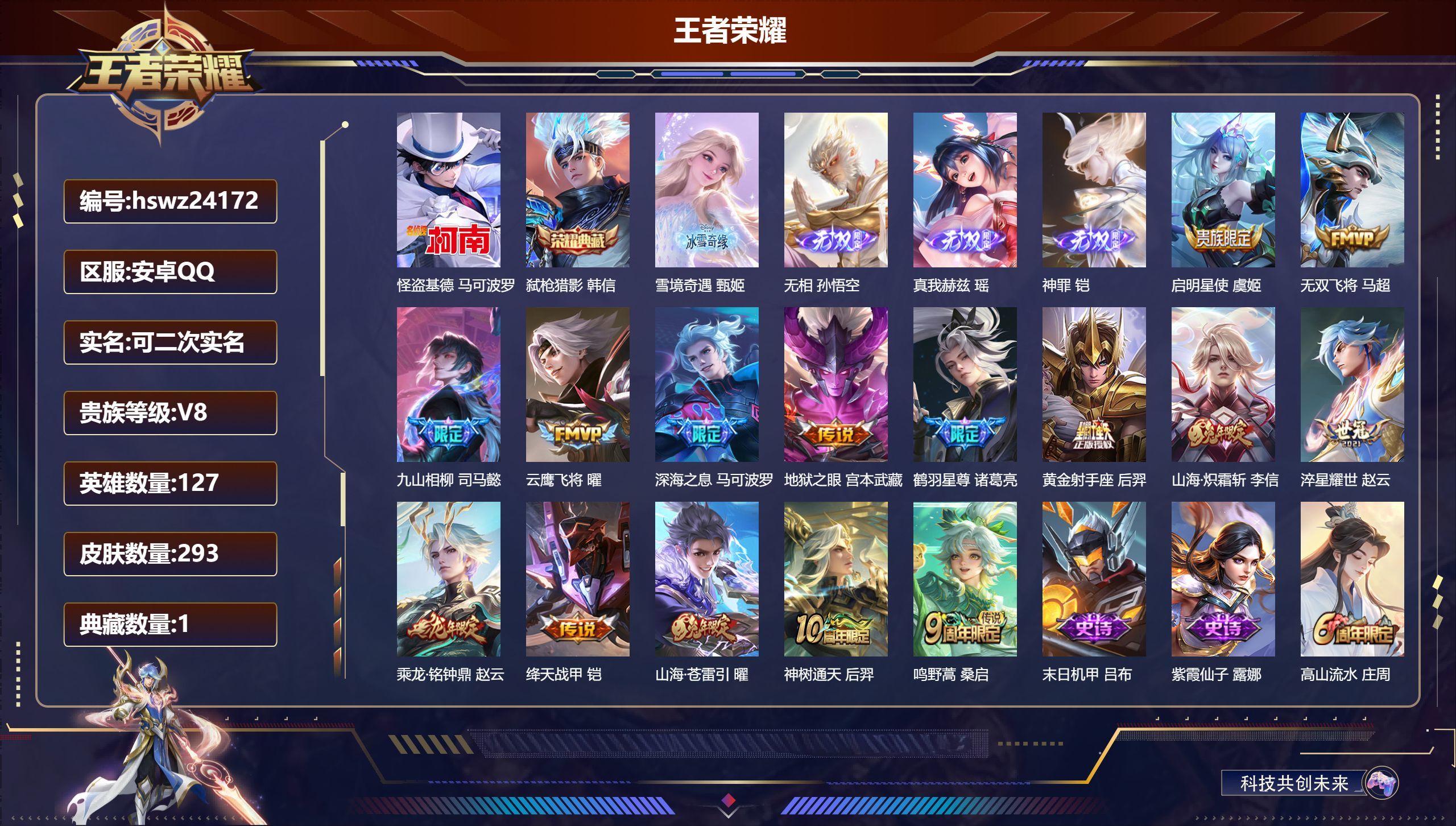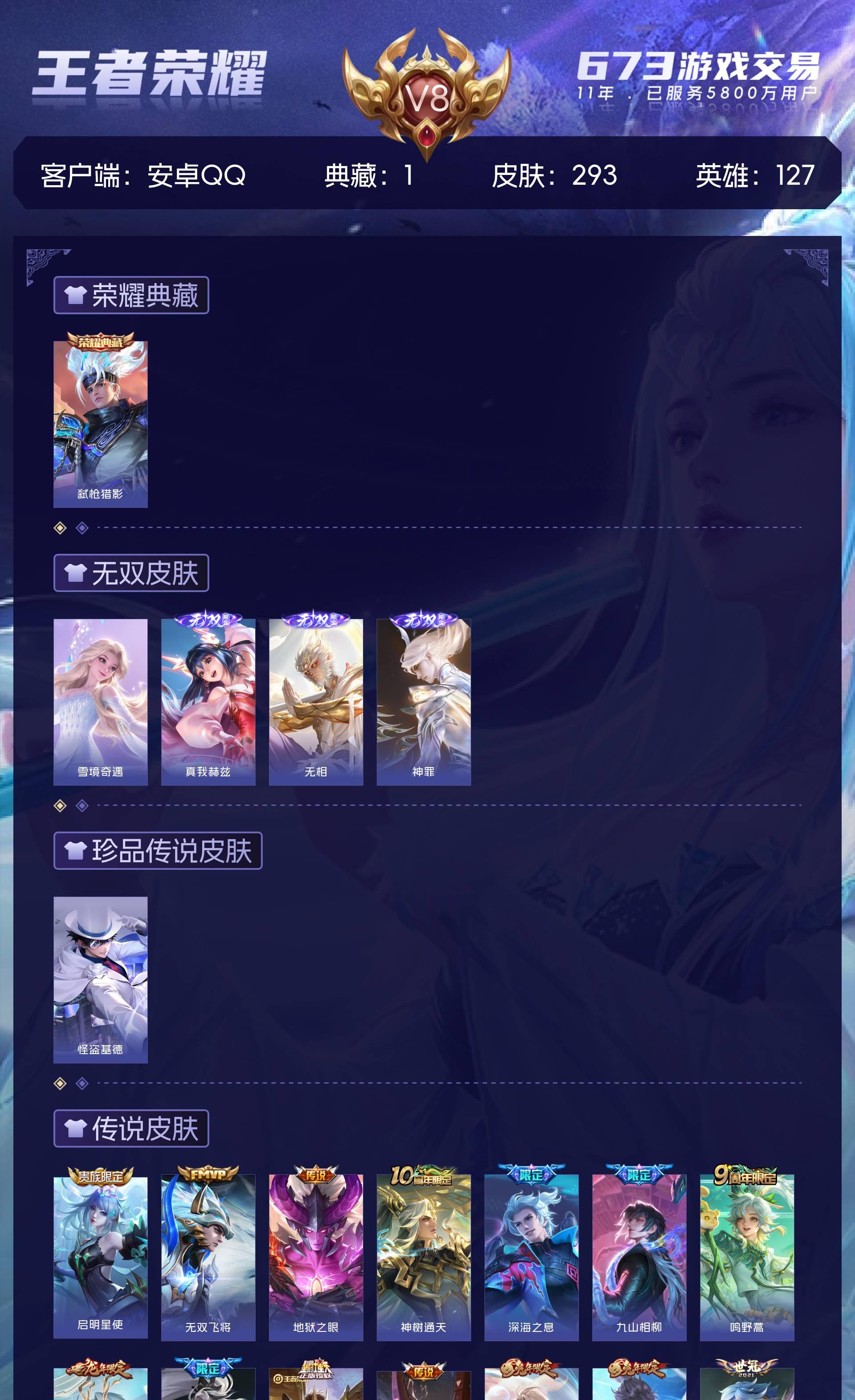 安卓QQ/荣耀王者/293皮肤/127英雄/1典藏/0珍品无双/4无双/1珍品传说/15传说/101