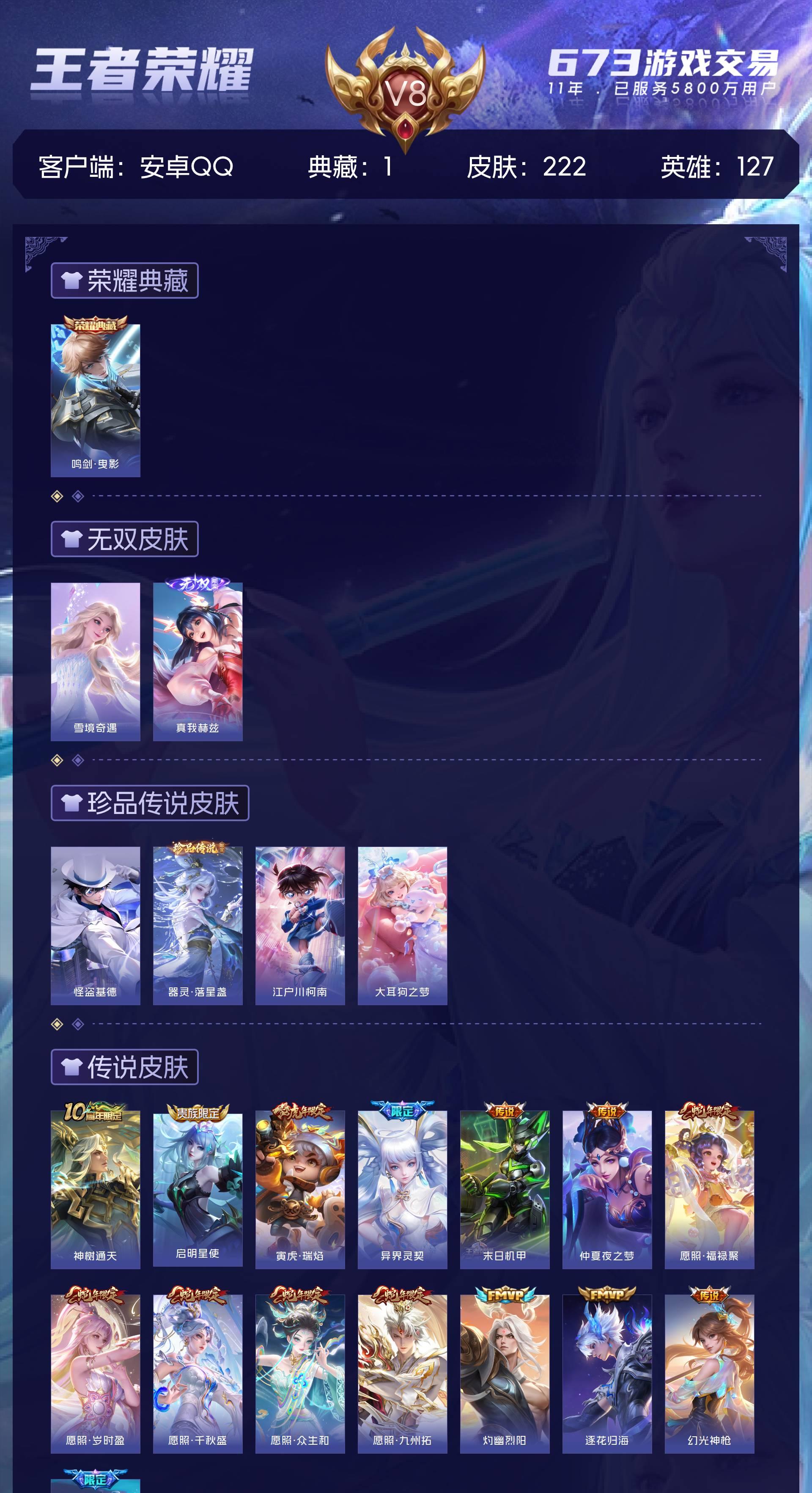 V8 皮肤222 英雄127 永恒钻石 荣耀典藏1 无双皮肤2 珍品传说4 传说15 其他皮肤206