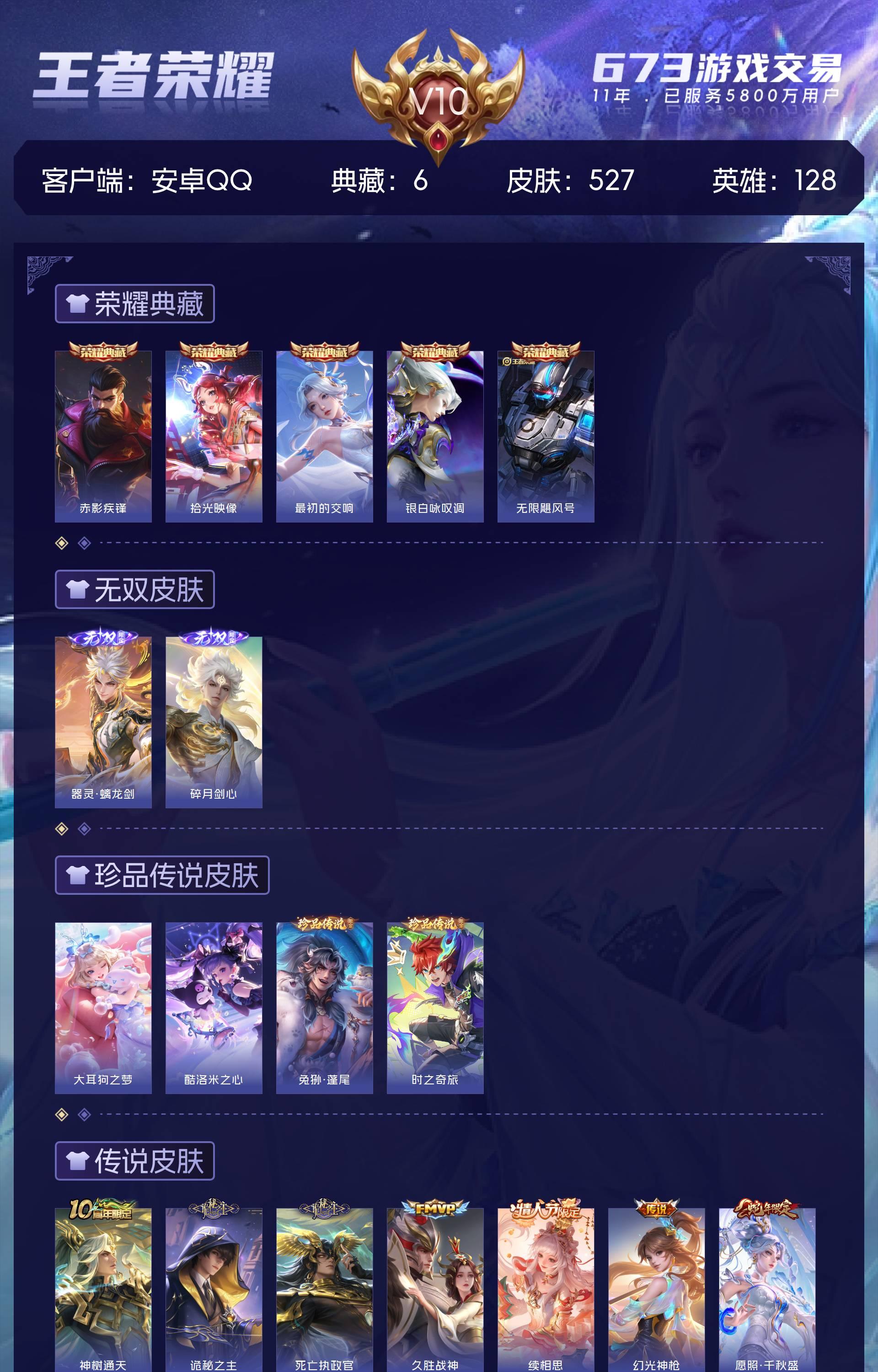 安卓QQ/至尊星耀/527皮肤/128英雄/5典藏/0珍品无双/2无双/4珍品传说/55传说/180
