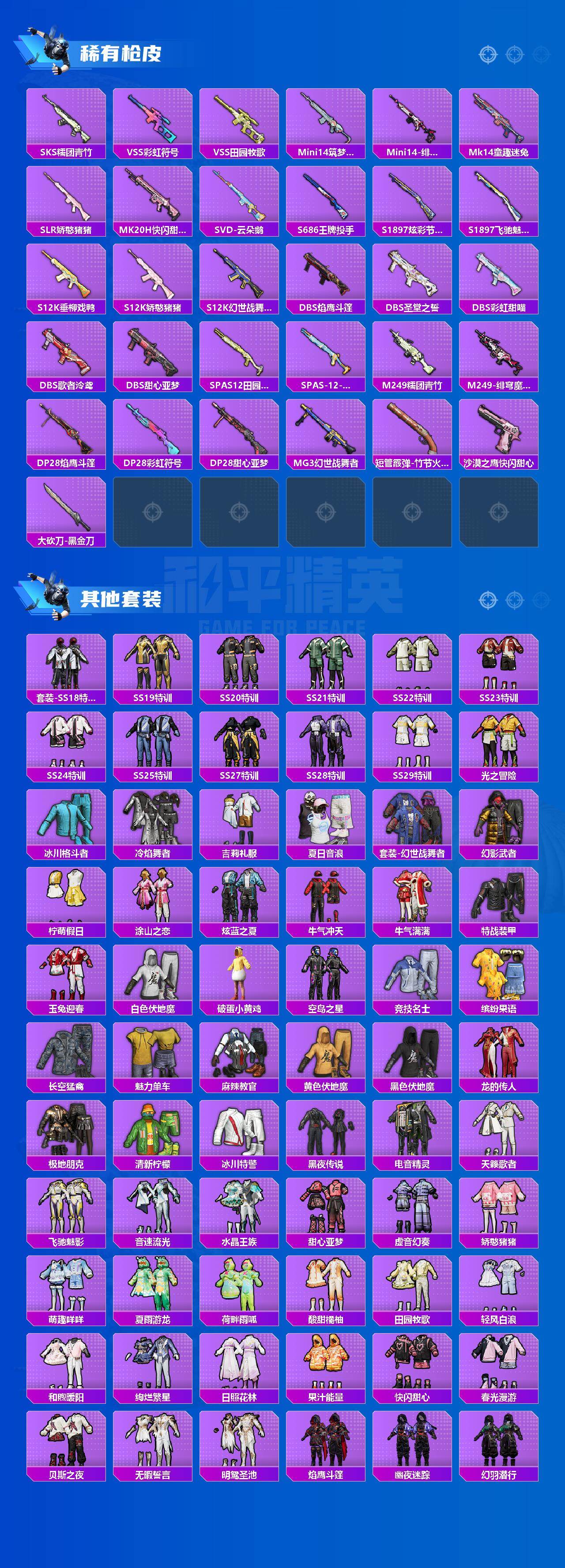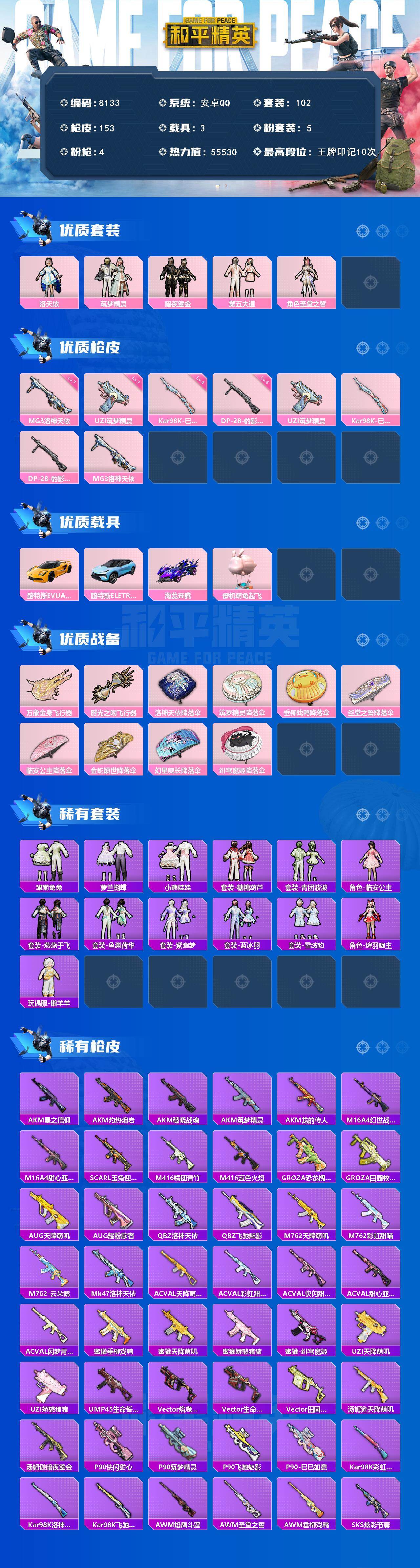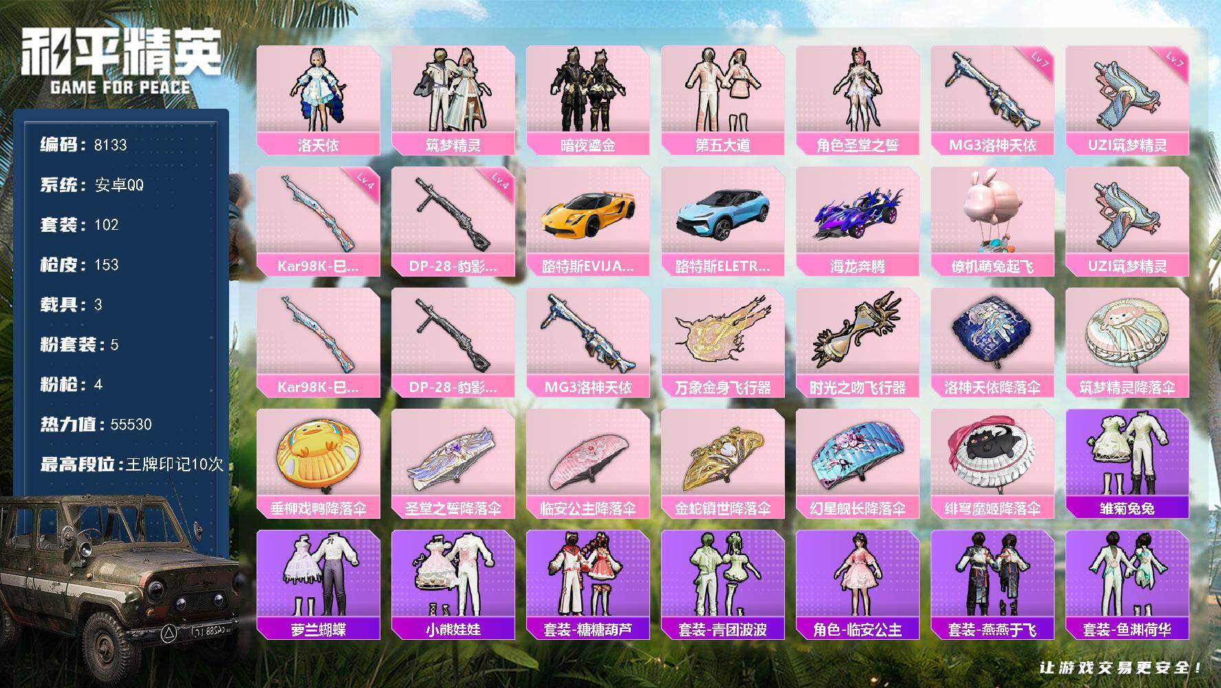 【8133】5粉装-4特效枪-3载具-2粉色飞行器-55530热力值-10王牌印记-102套装-153枪皮