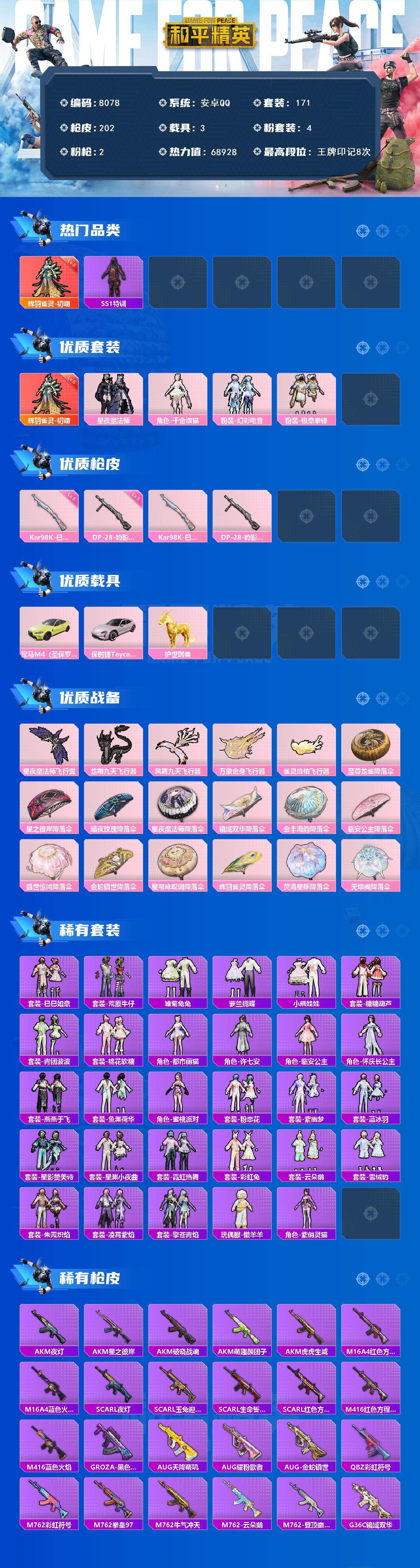 【8078】1神装-4粉装-2特效枪-3载具-5粉色飞行器-68928热力值-8王牌印记-171套装-202枪皮【红色神装等级】:五级辉羽雀灵-初翊【红色角色神装】:辉羽雀灵-初翊