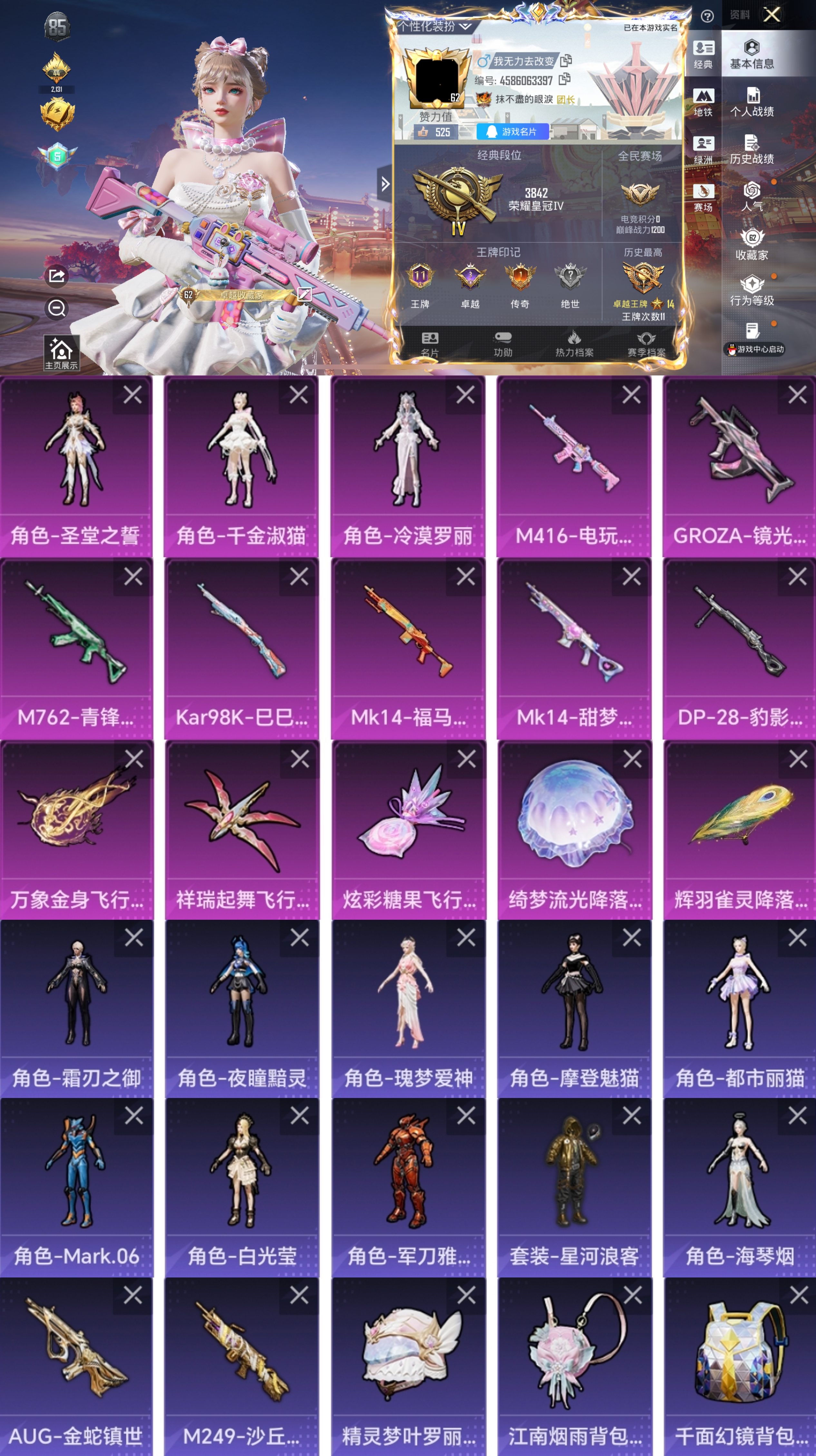 LGH561【7特3粉地铁号千金淑猫圣堂之誓冷漠罗丽万象金身飞行器素材号】(可二次实名) 苹果Q-3粉装6特效枪7热门150套装209枪皮 61245热力值 11印记 历史卓越王牌14星 【3粉装】 圣堂之誓 千金淑猫 冷漠罗丽 【6特效枪】 M416-电玩时刻 (5级) Kar98K-巳巳如意 (5级) M762-青锋波束 (5级) DP-28-豹影疾电 (5级) Mk14-甜梦熊击 (5级)