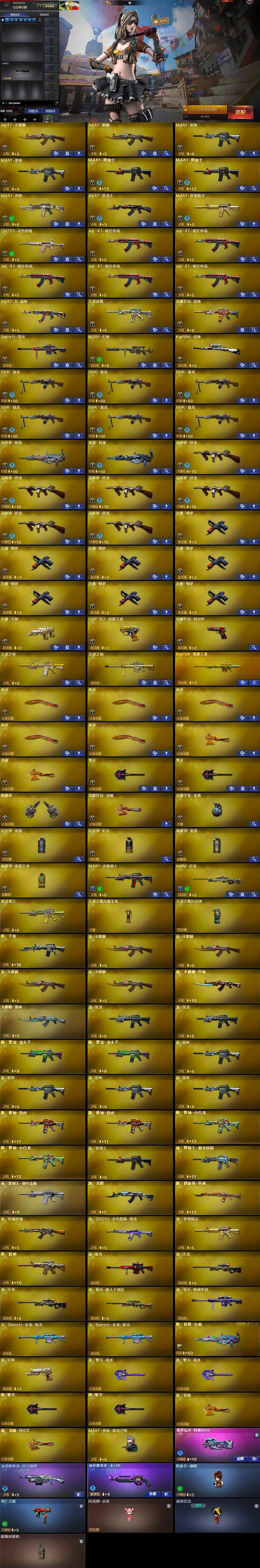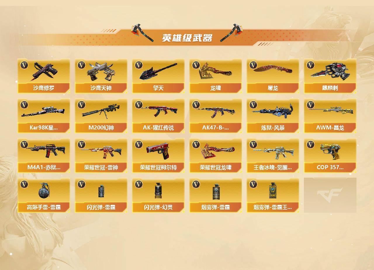 【热门武器】:QBZ03-金色蔷薇,M200-幻神,死亡之眼,荣耀世冠-雷神,荣耀世冠-柯尔特,Kar98K-星神,M4A1-黑骑士*2,汤姆逊-烈龙*6,RPK-盘龙*6,加特林-炼狱,斯泰尔-蝴蝶,沙鹰-修罗*7,荣耀世冠-龙啸