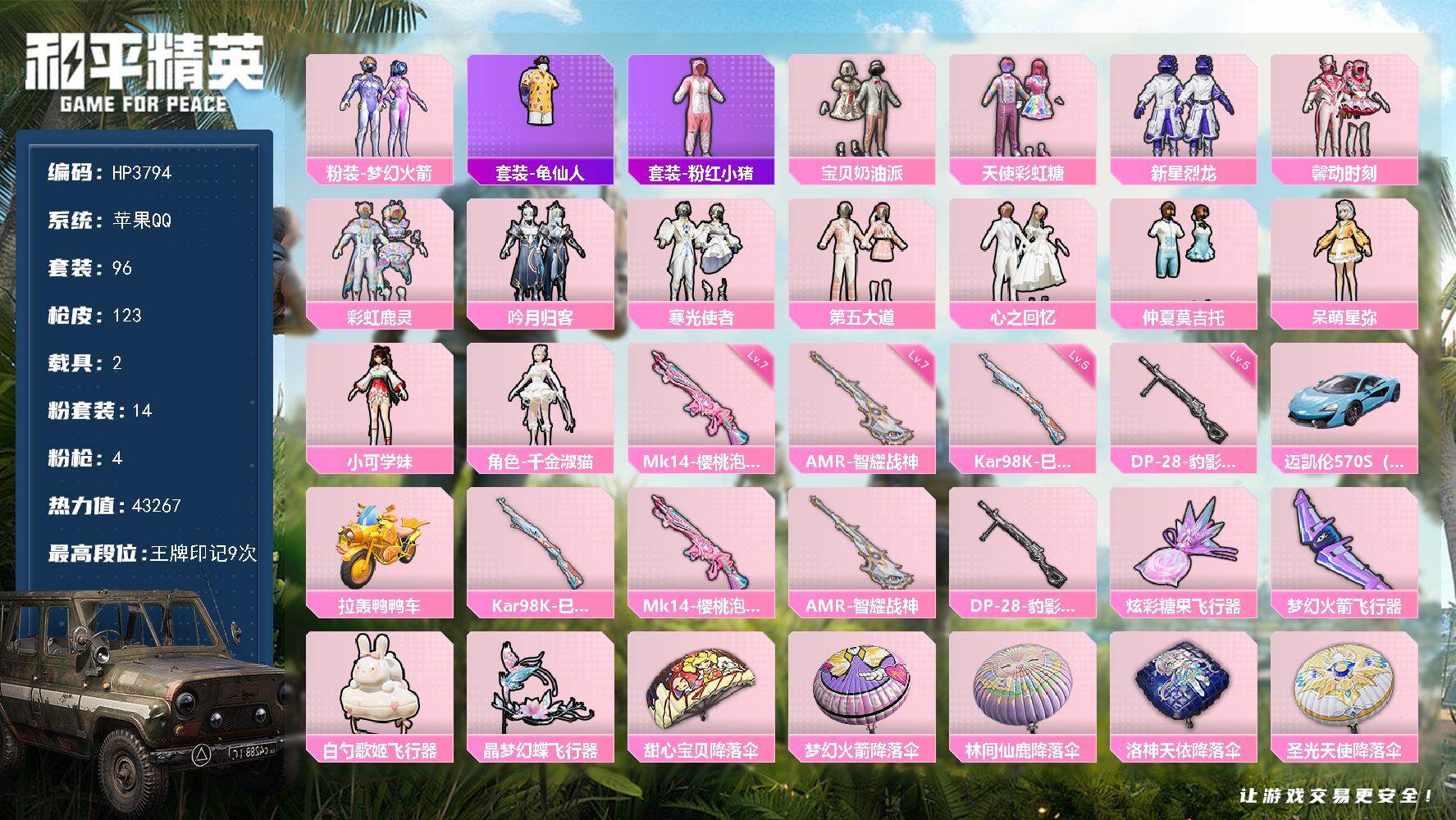 苹果 手Q-14粉装-4特效枪-2载具-4粉色飞行器-43267热力值-9王牌印记-96套装-123枪皮