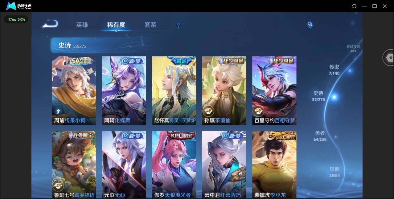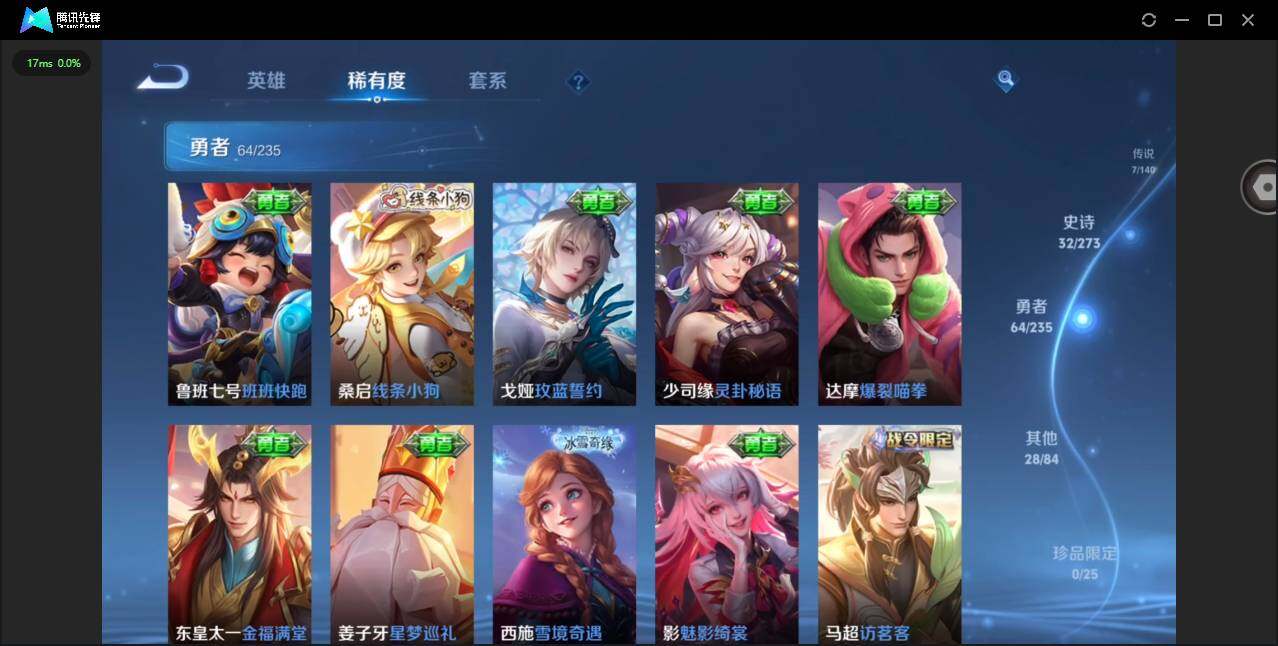 实名: 可修改 贵族等级: V7 英雄数: 118 皮肤数: 131 传说皮: 黄金射手座,地狱火,零号·赤焰,幻光神枪 限定皮: 李小龙,岱宗,天狼溯光者,冰霜恋舞曲,青龙志,大圣娶亲,鸣野蒿,逐霄战戟,愿照·千秋盛,愿照·众生和