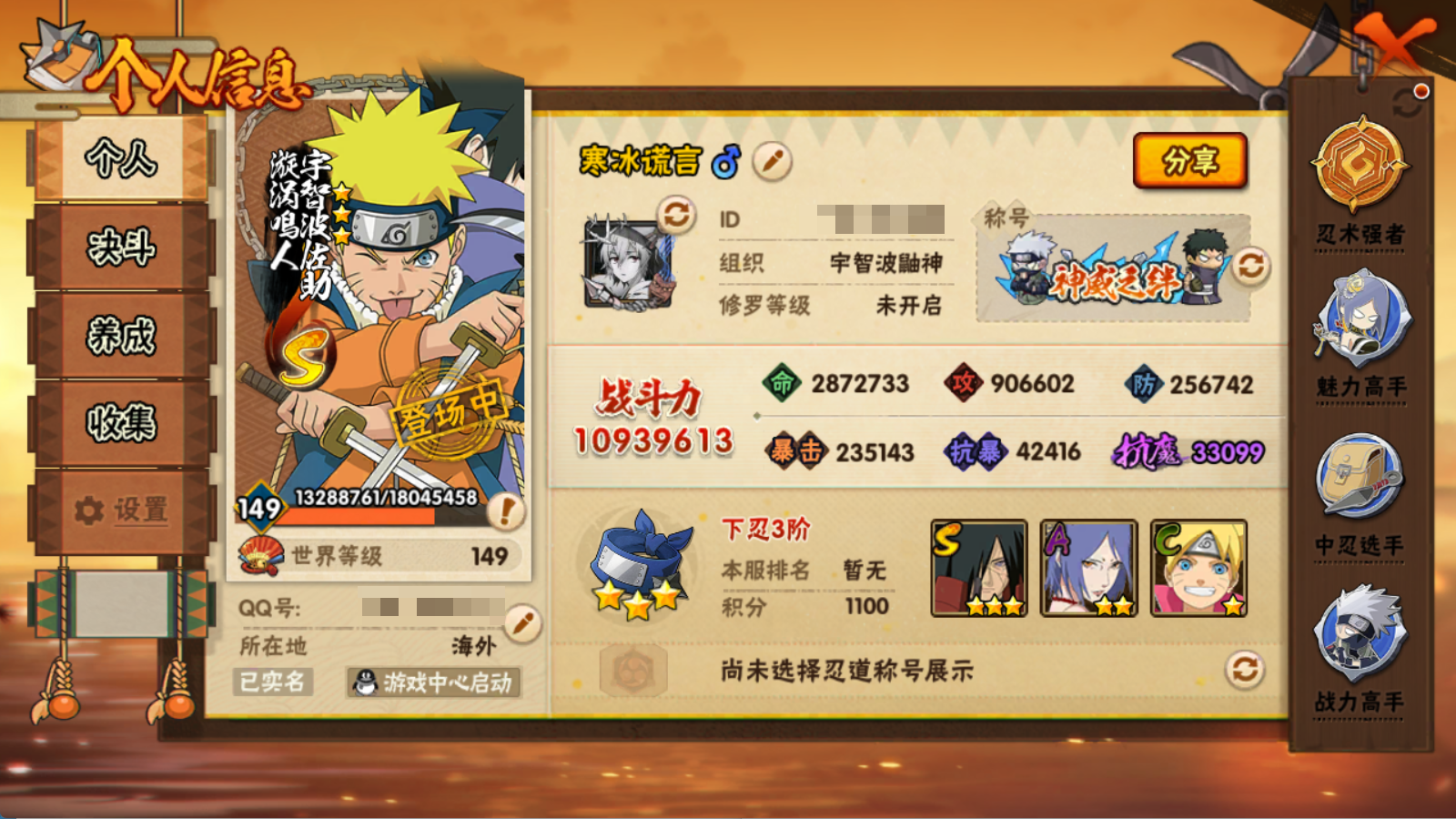 (可转苹果)1093W战力 破面 死水 死二19S+漂泊小南 忍卡2个198直购43A+三百战
