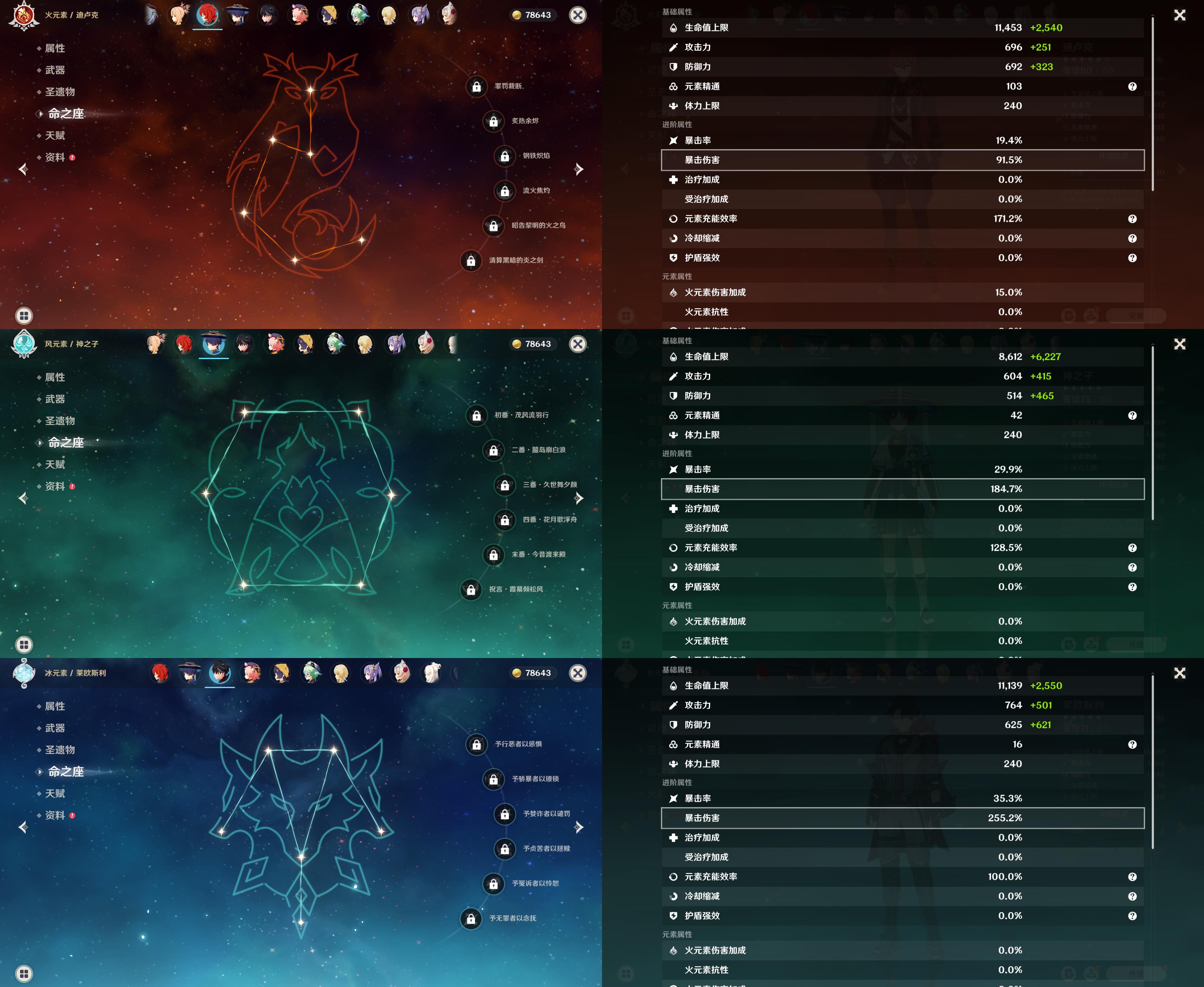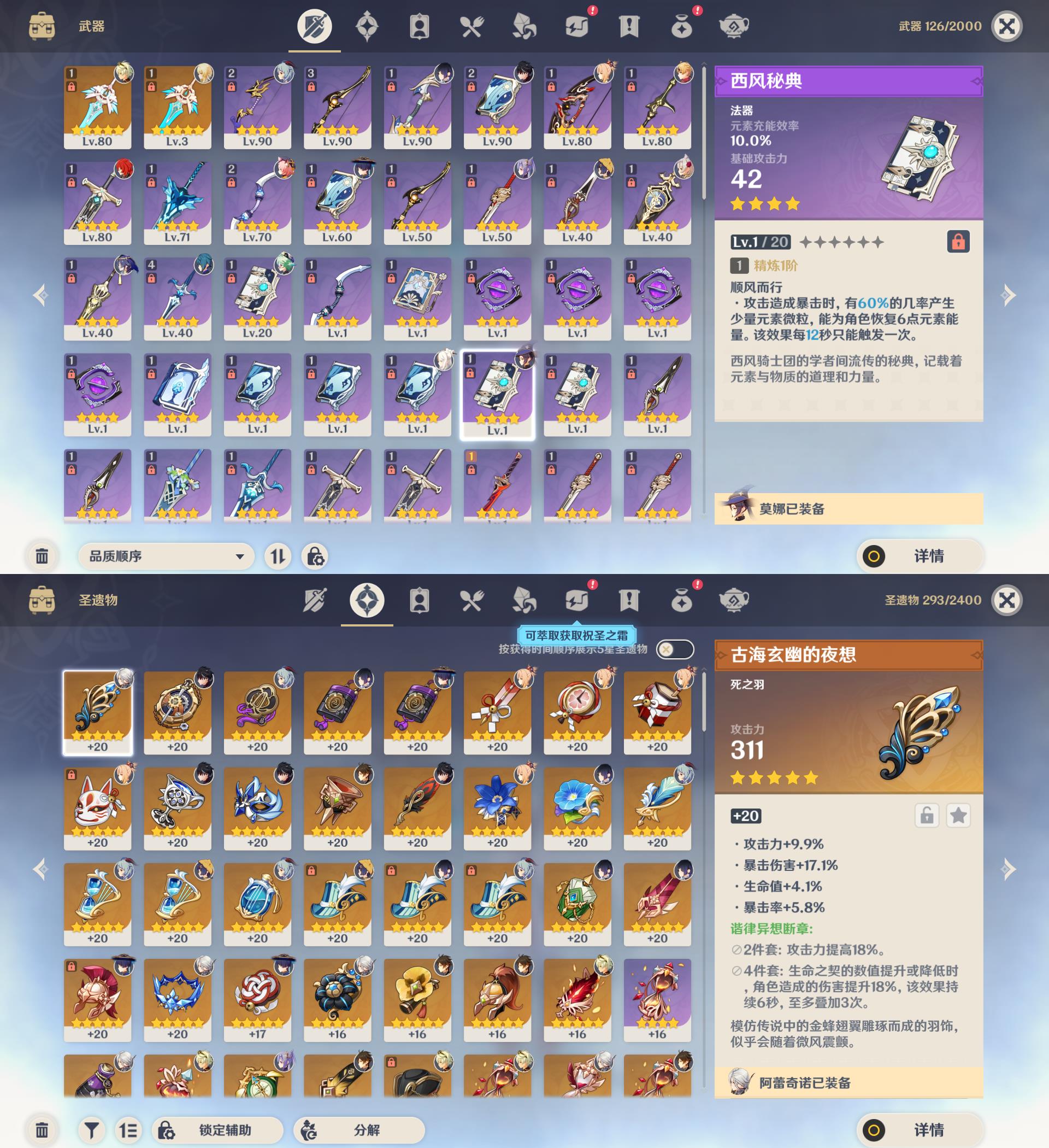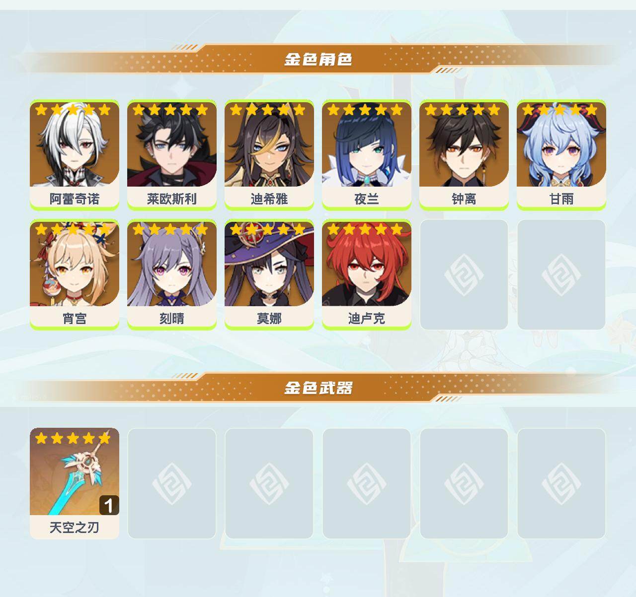 【YS1191】55级/12黄/女主/10个五星角色/2个五星武器/阿蕾奇诺/夜兰/钟离/甘雨/宵宫/迪卢克/莱欧斯利/刻晴/莫娜/迪希雅/天空之刃