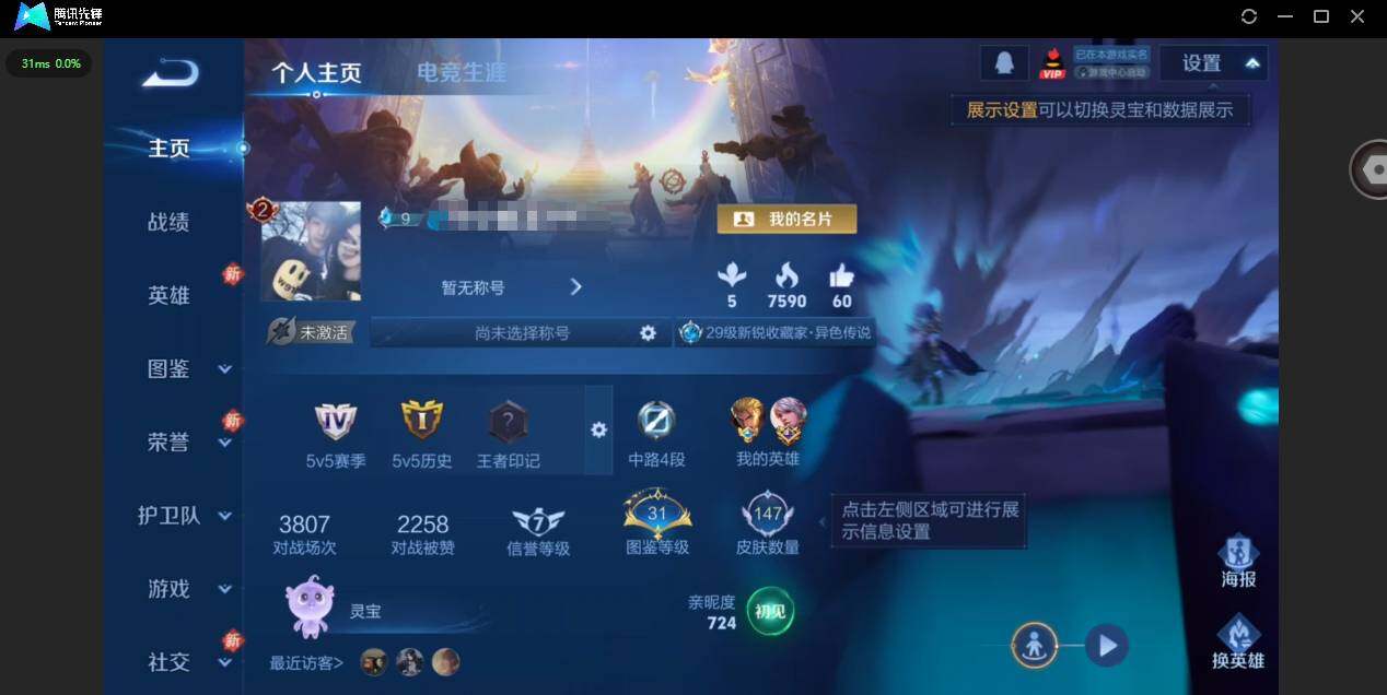 /实名: 可修改 贵族等级: V7 英雄数: 122 皮肤数: 147 星传说: 幽冥之眼 传说皮: 久胜战神,地狱之眼,典韦战鼓燎原 限定皮: 梁祝,武圣,至尊宝,愿照·九州拓