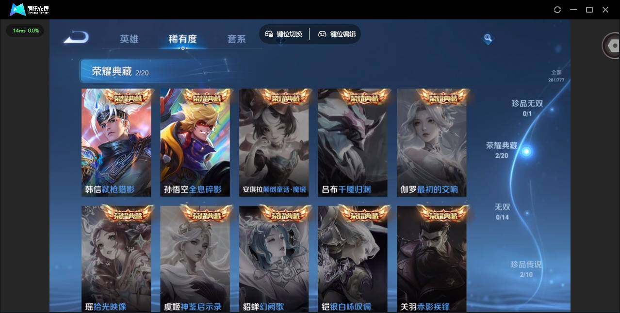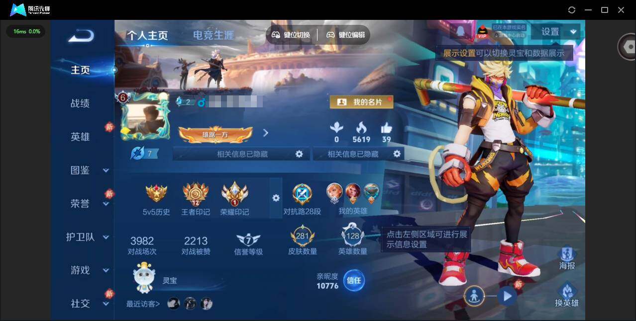贵族等级: V8 英雄数: 128 皮肤数: 281 荣耀水晶: 全息碎影,弑