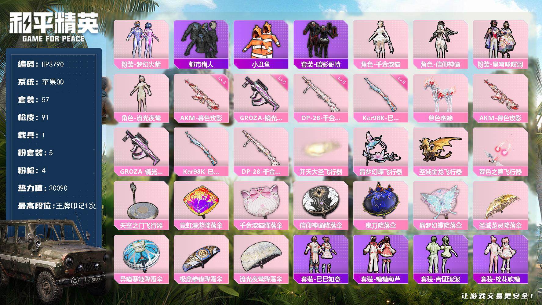 苹果 手Q-5粉装-4特效枪-1载具-5粉色飞行器-30090热力值-1王牌印记-57套装-91枪皮
