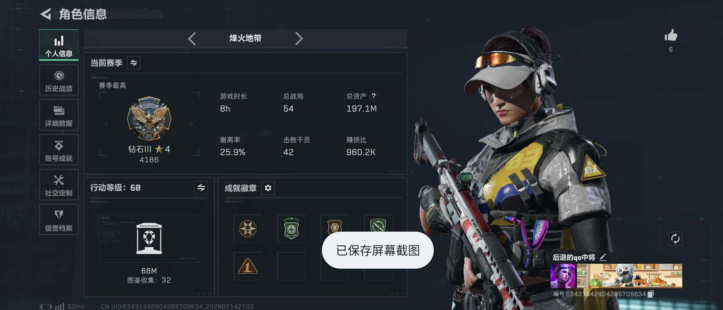 197m总资产-4917k哈伏币-60烽火等级-钻石-1战场等级-无军衔【干