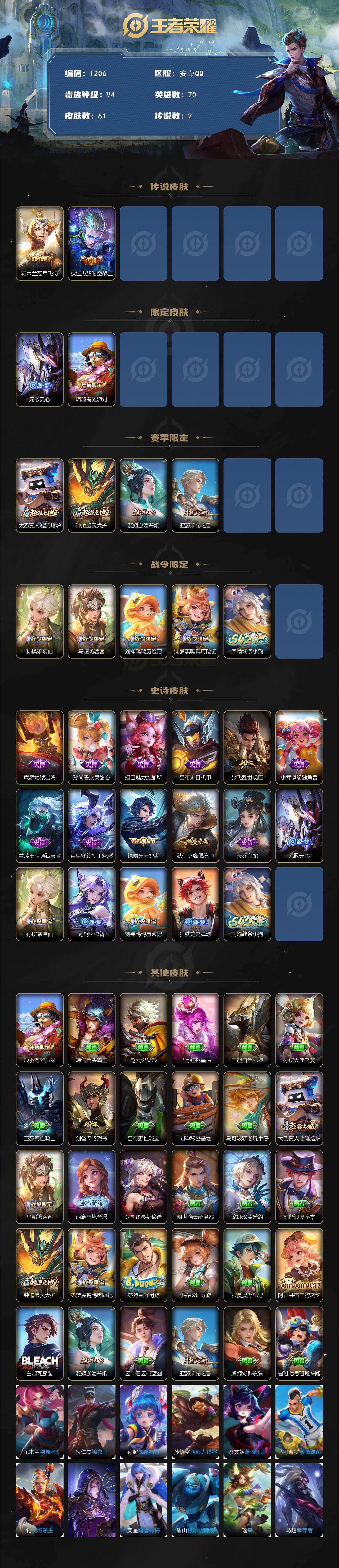 2286562 王者荣耀账号 安卓Q-V4-尊贵铂金III段位-70英雄-61皮肤-2传说-16史诗