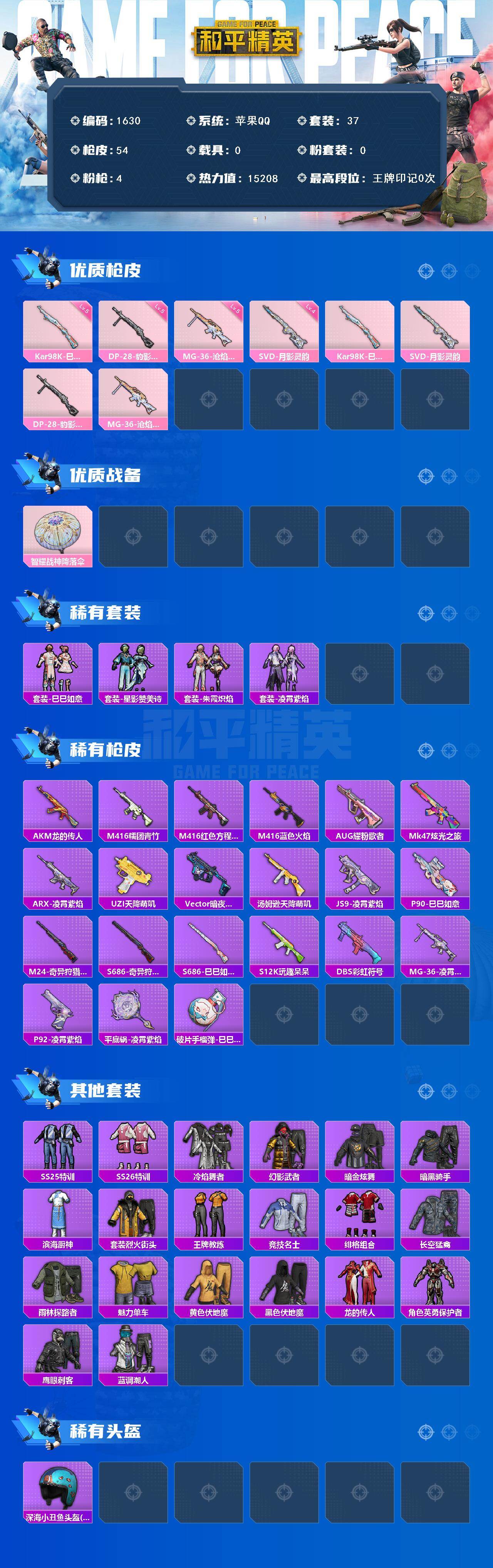 苹果 手Q-0粉装-4特效枪-0载具-0粉色飞行器-15208热力值-1王牌印记-37套装-54枪皮