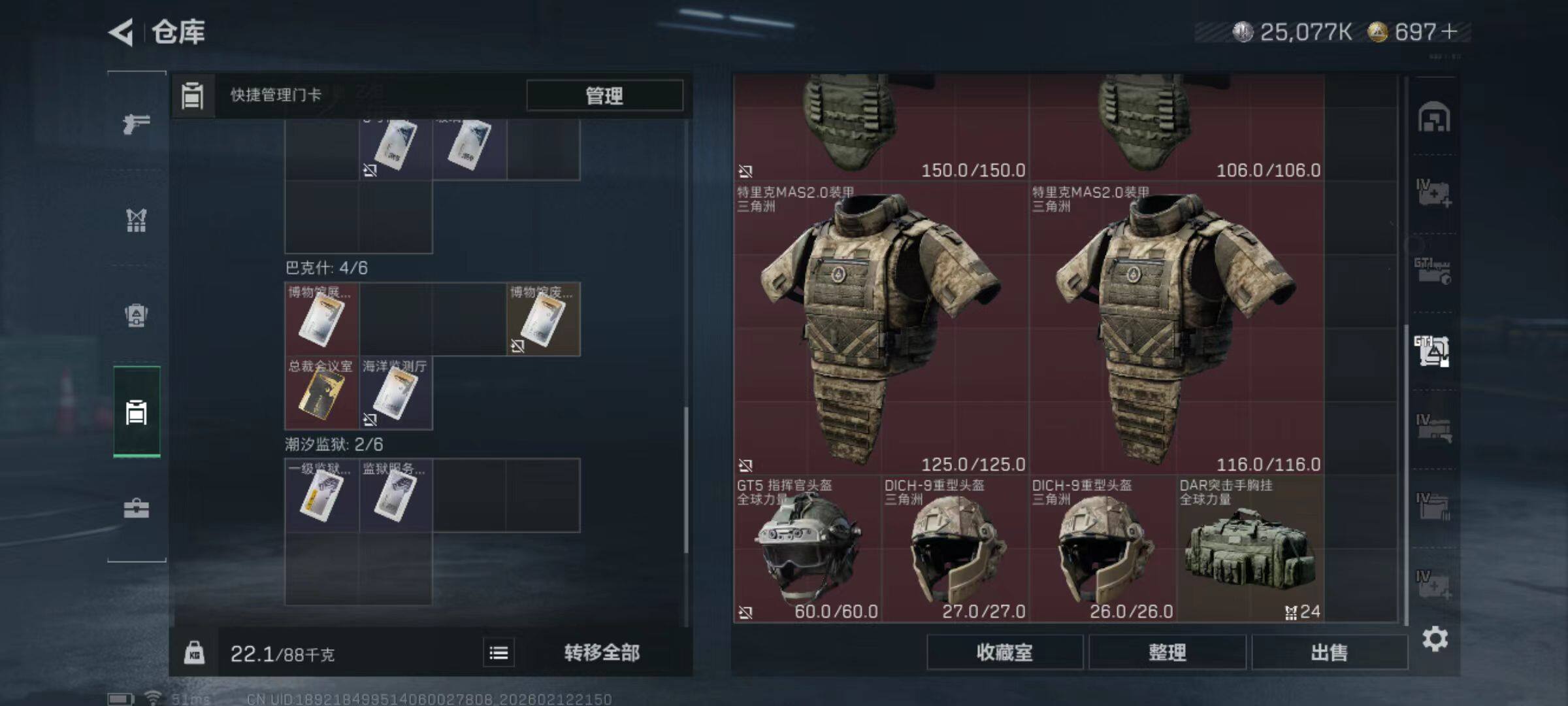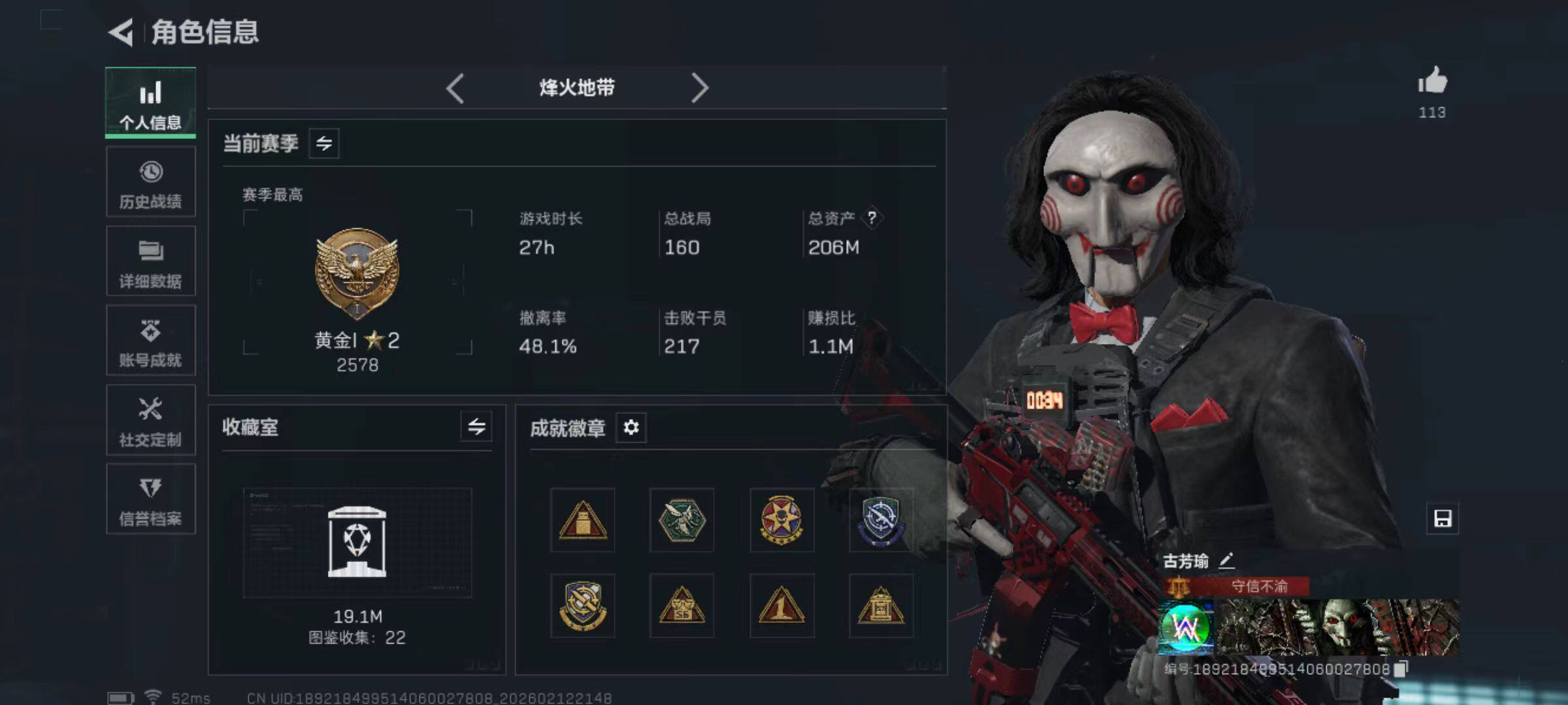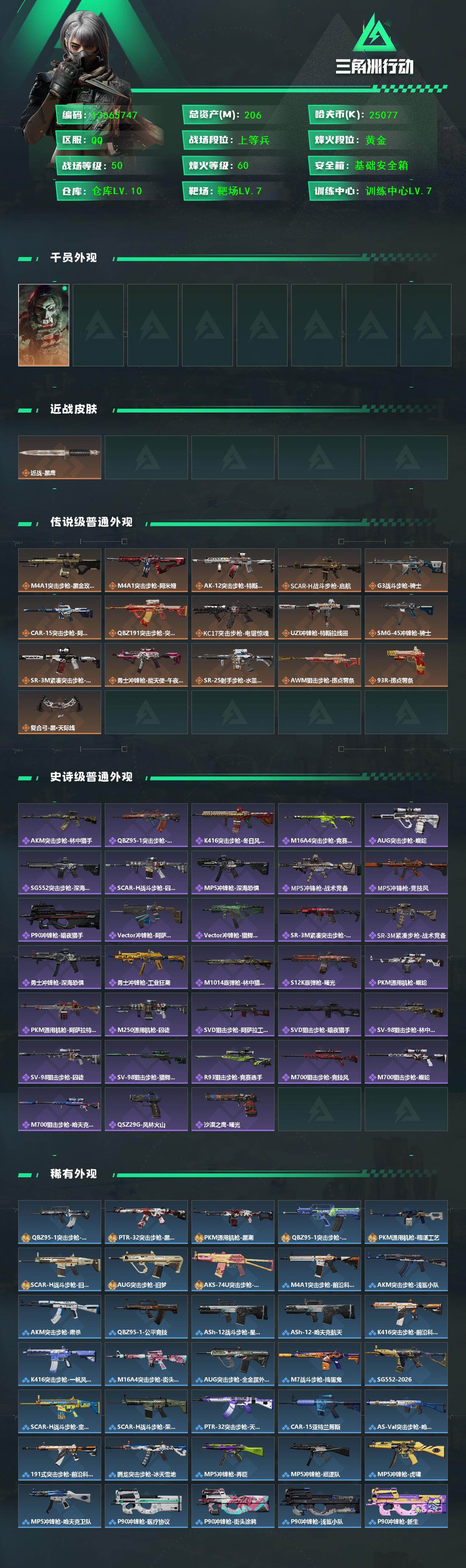 总资产(M):206M/哈夫币(K):25077K/哈夫币(K):25077K/传说枪皮数:16/全面战场等级:50_段位:上等兵/烽火地带等级:60_段位:黄金/红狼-电锯惊魂/近战-黑鹰/M4A1突击步枪-蚀金玫瑰/M4A1突击步枪-阿米娅/AK-12突击步枪-特斯拉线圈/SCAR-H战斗步枪-启航/G3战斗步枪-骑士/CAR-15突击步枪-阿米娅/腾龙突击步枪-捞点薯条/KC17突击步枪-
