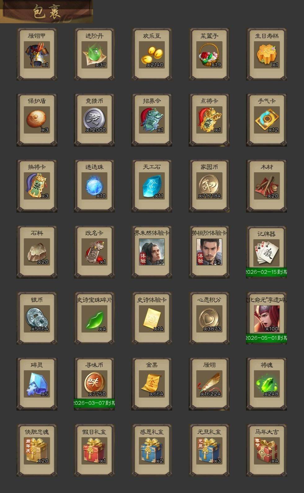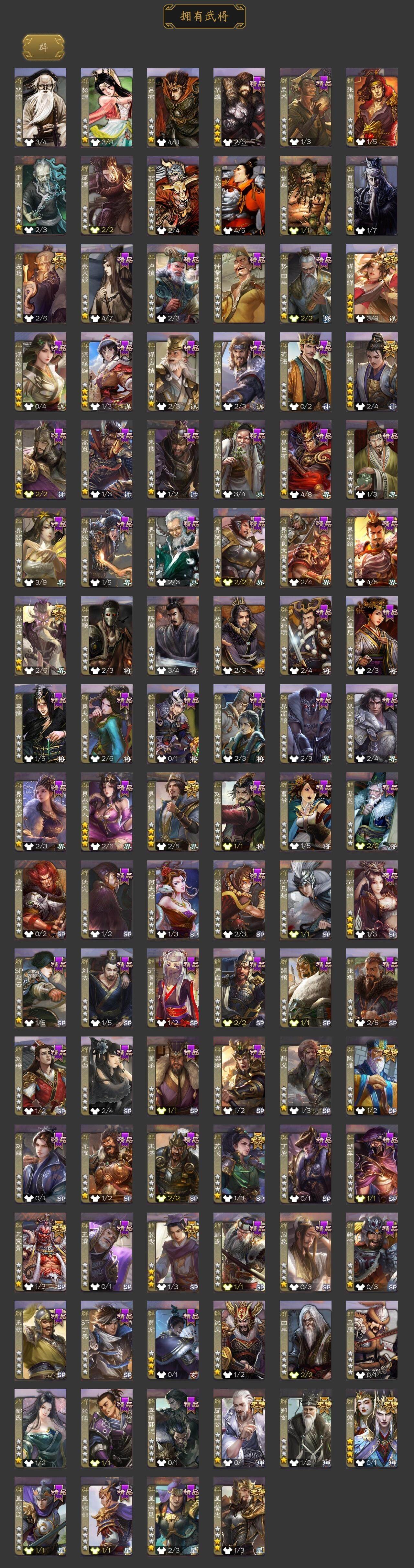 【1447】官阶:大将军;VIP等级:VIP12;史诗武将数量:52;动态皮肤数量:47;武将总数:405;史诗宝珠数量:0;将魂数量:248;神将:6;魏国史诗武将:23;蜀国史诗武将:11;吴国史诗武将:11;群史诗武将:14