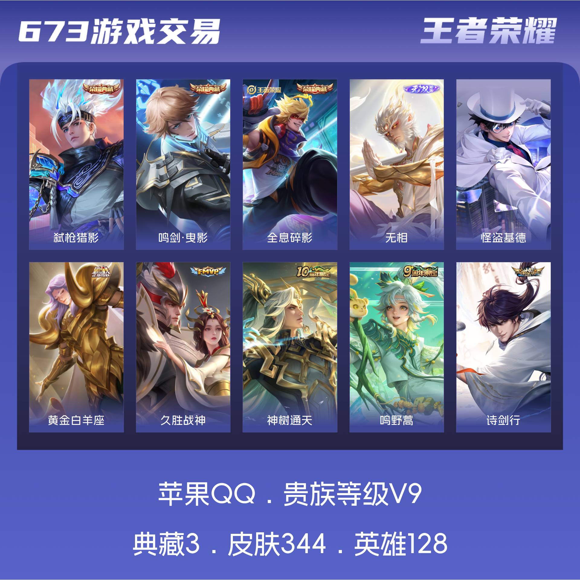 V9 皮肤344 英雄128 最强王者 荣耀典藏3 无双皮肤1 珍品传说1 传说19 其他皮肤326