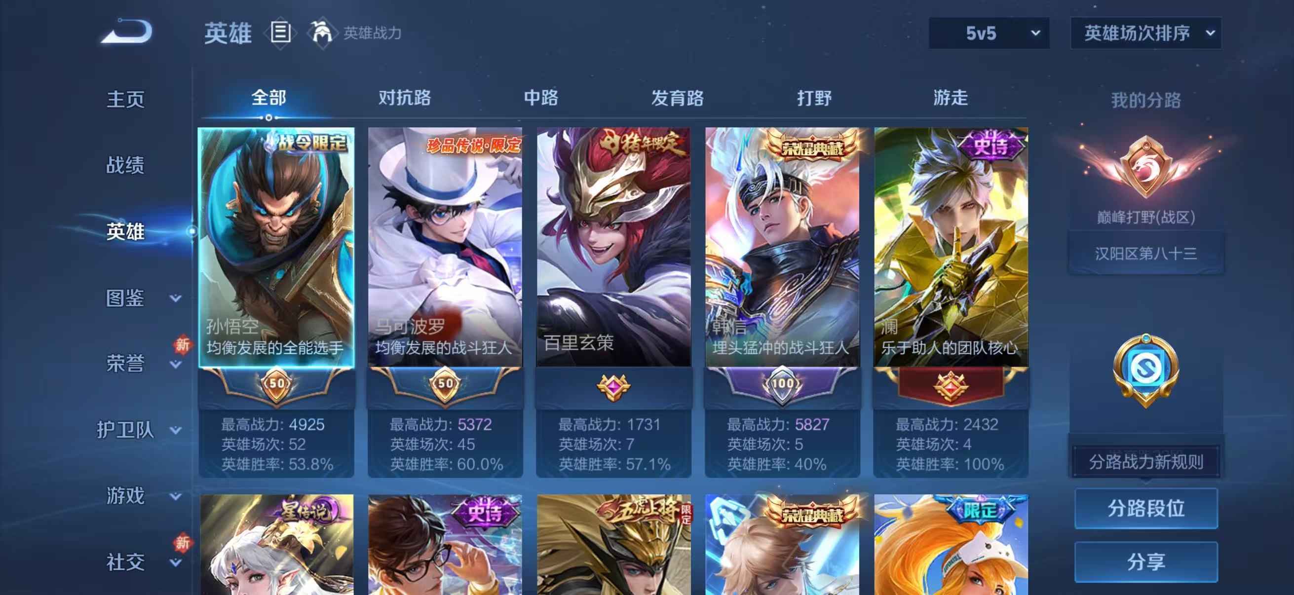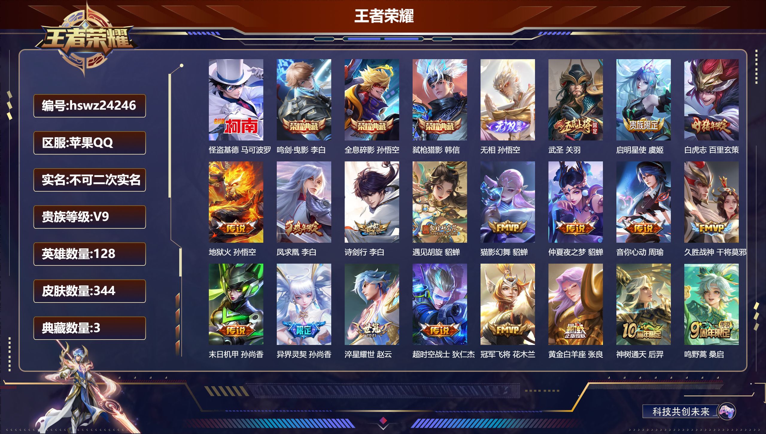 苹果QQ/最强王者/344皮肤/128英雄/3典藏/0珍品无双/1无双/1珍品传说/19传说/100