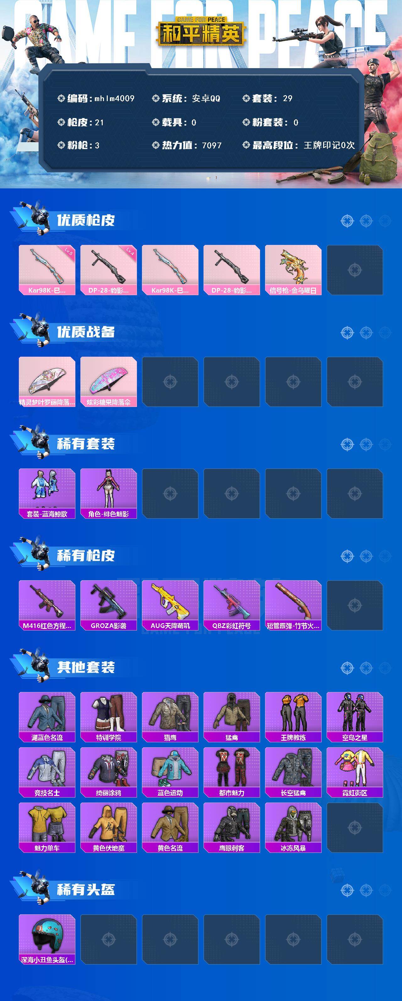 【mhlm4009】安卓 手Q-0粉装-3特效枪-0载具-0粉色飞行器-7097热力值-2王牌印记-29套装-21枪皮
