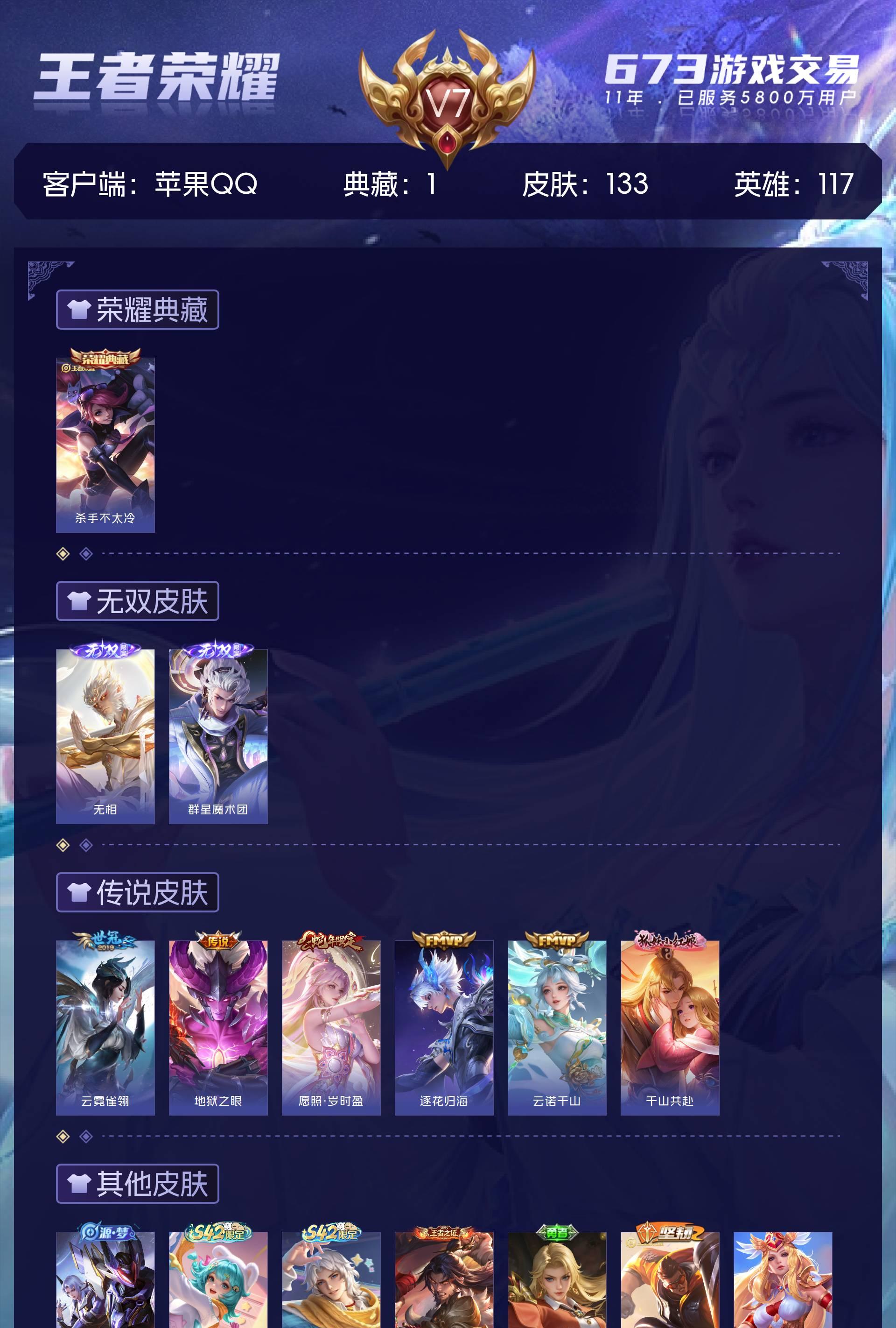 V7 皮肤133 英雄117 至尊星耀 荣耀典藏1 无双皮肤2 传说6 其他皮肤129