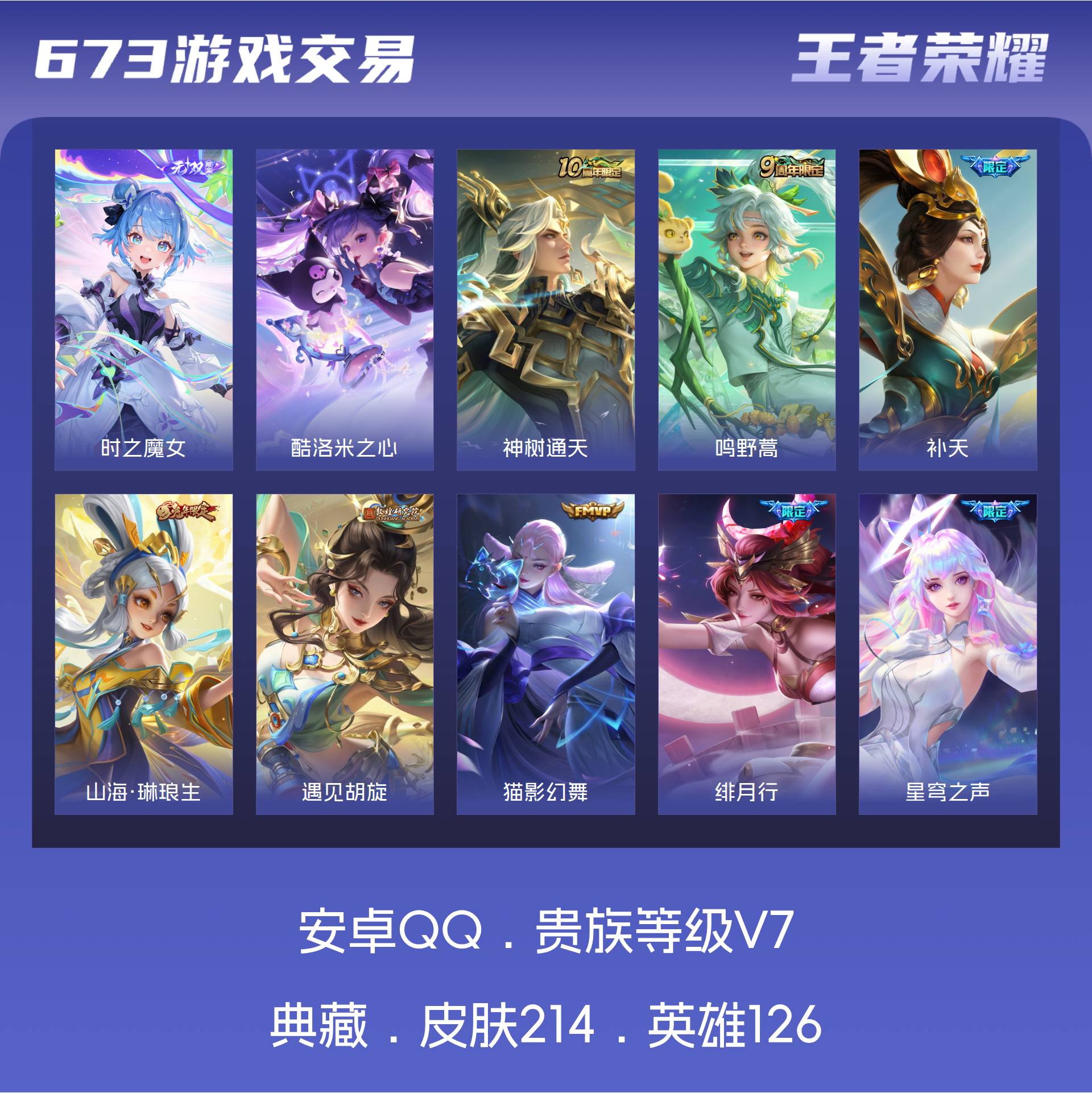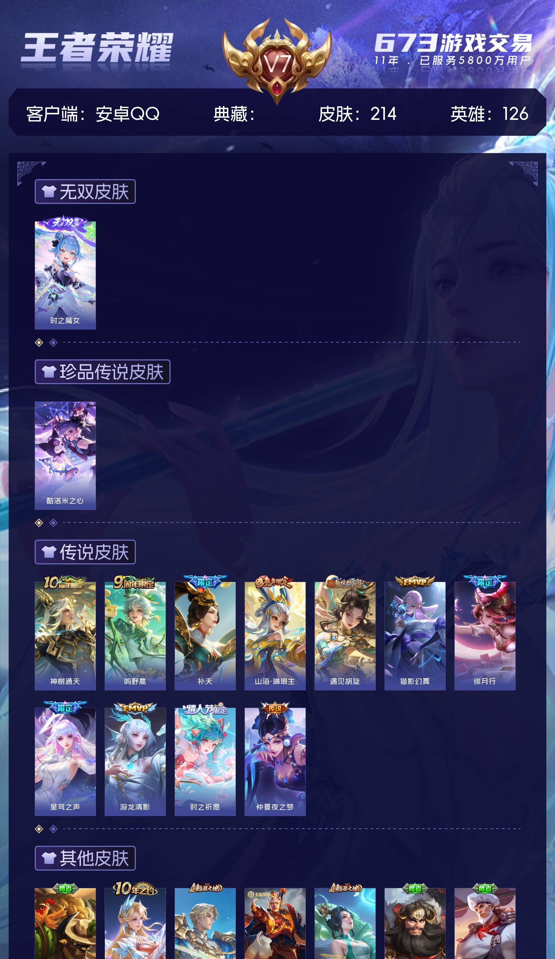 V7 皮肤214 英雄126 永恒钻石 无双皮肤1 珍品传说1 星传说1 传说11 其他皮肤207