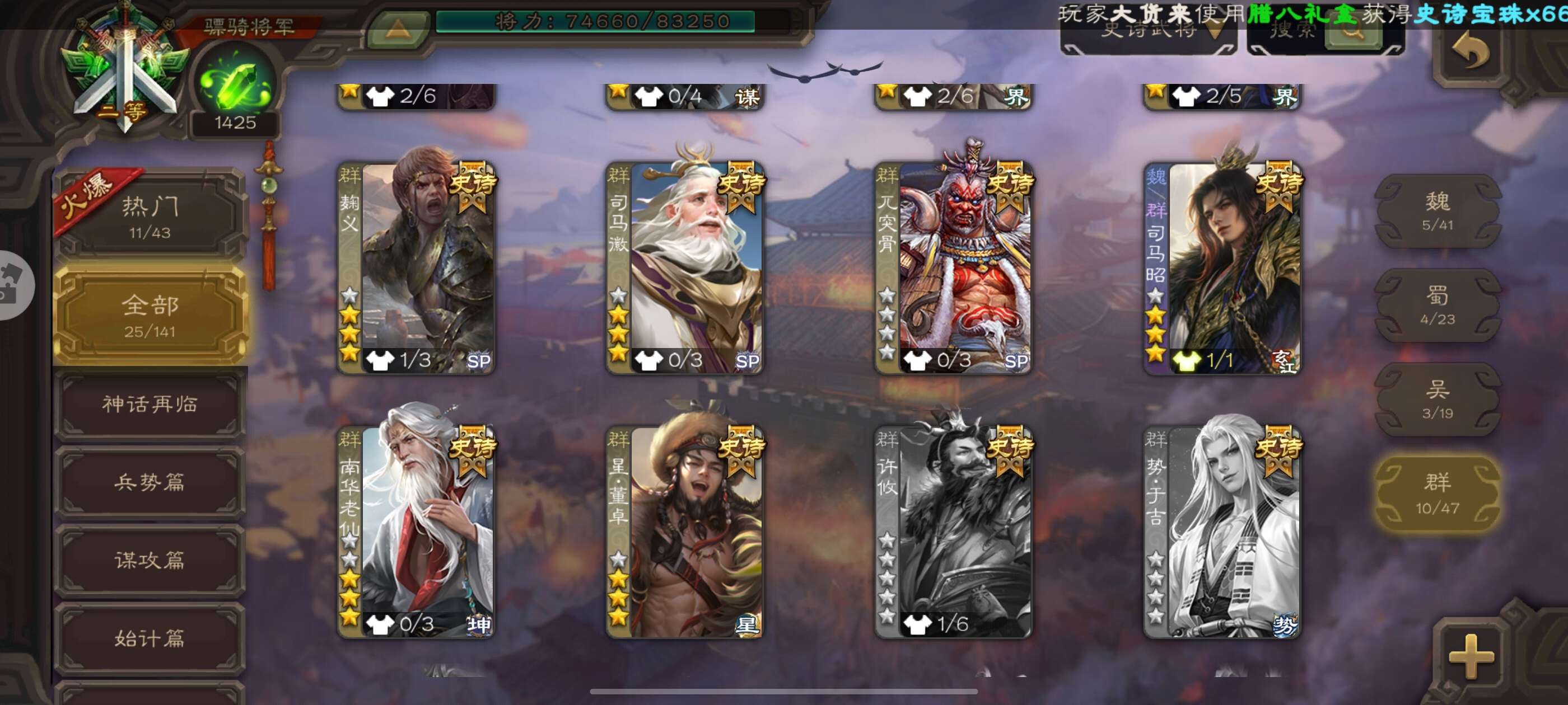 二等大将军,25史诗武将,24动皮,8宝珠将,性价比