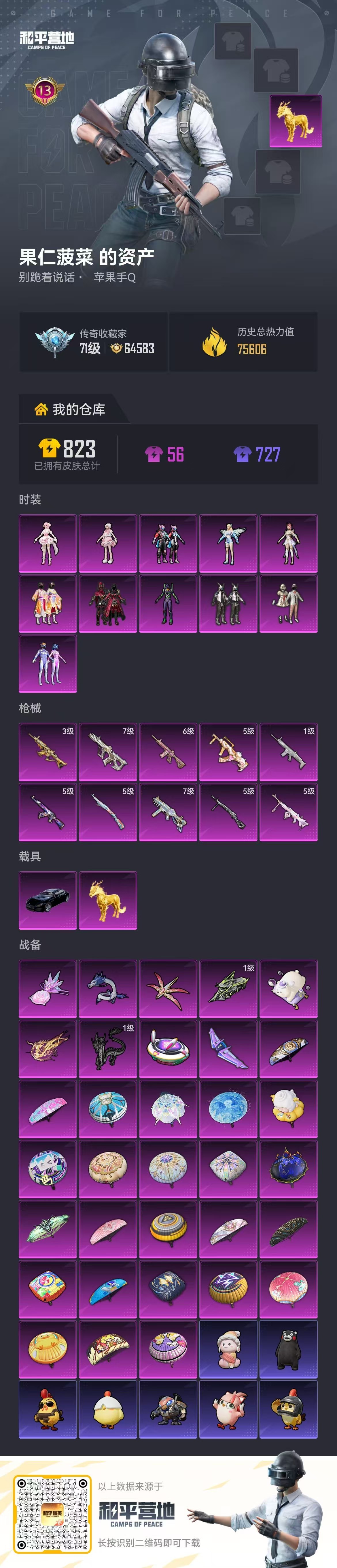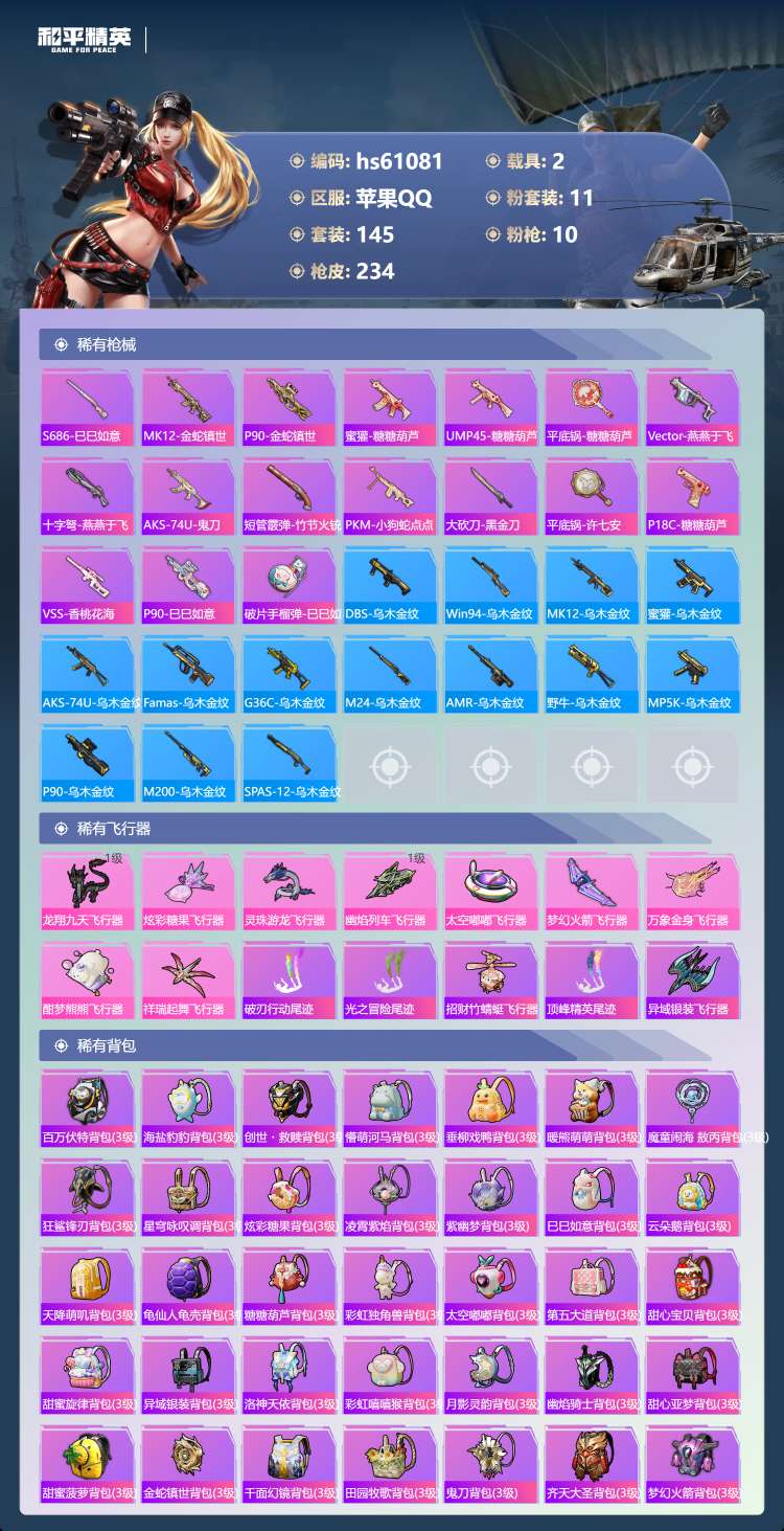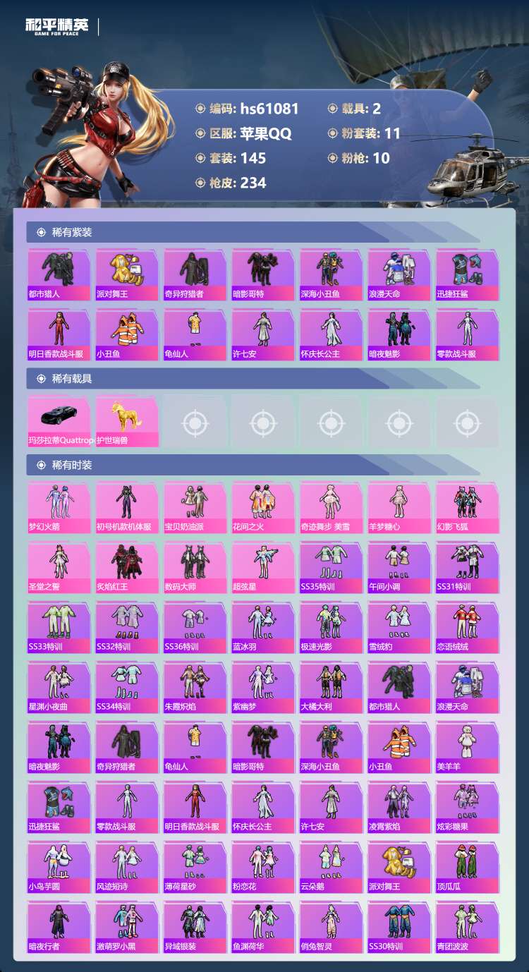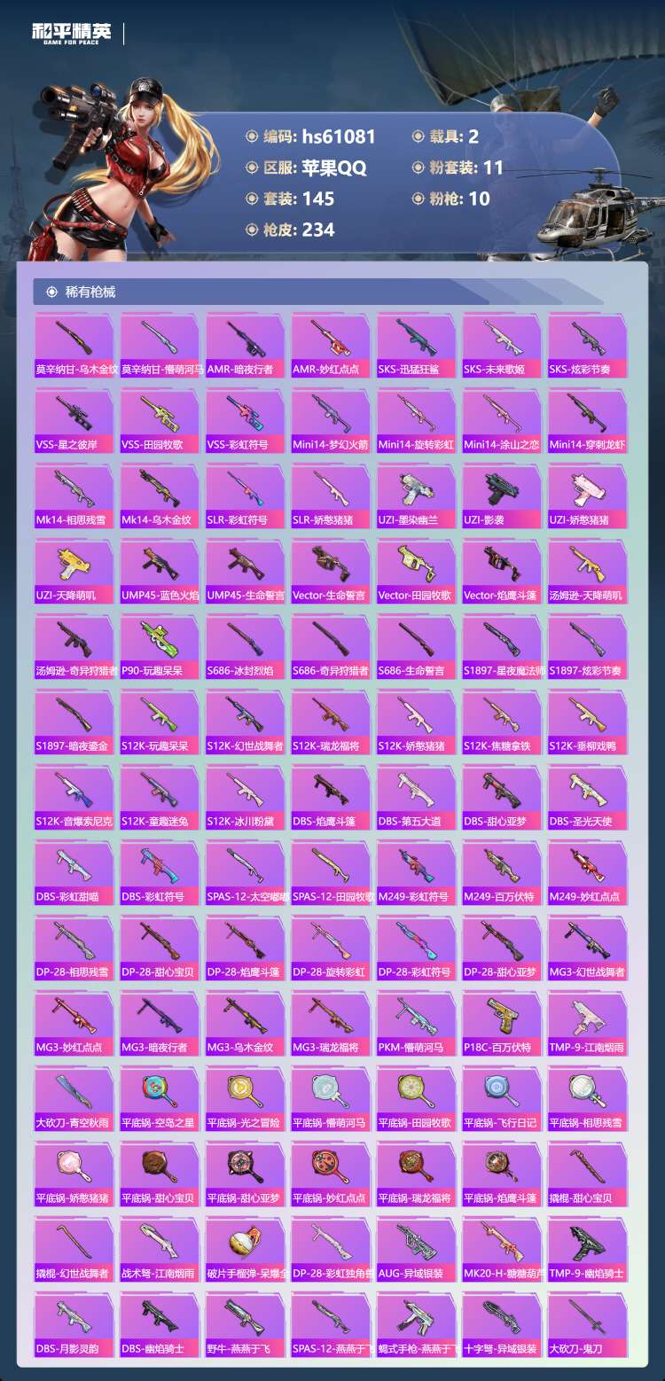hs61081 苹果手Q-13王牌印记-11粉装-10特效枪-2载具-75606热力值-145套装-