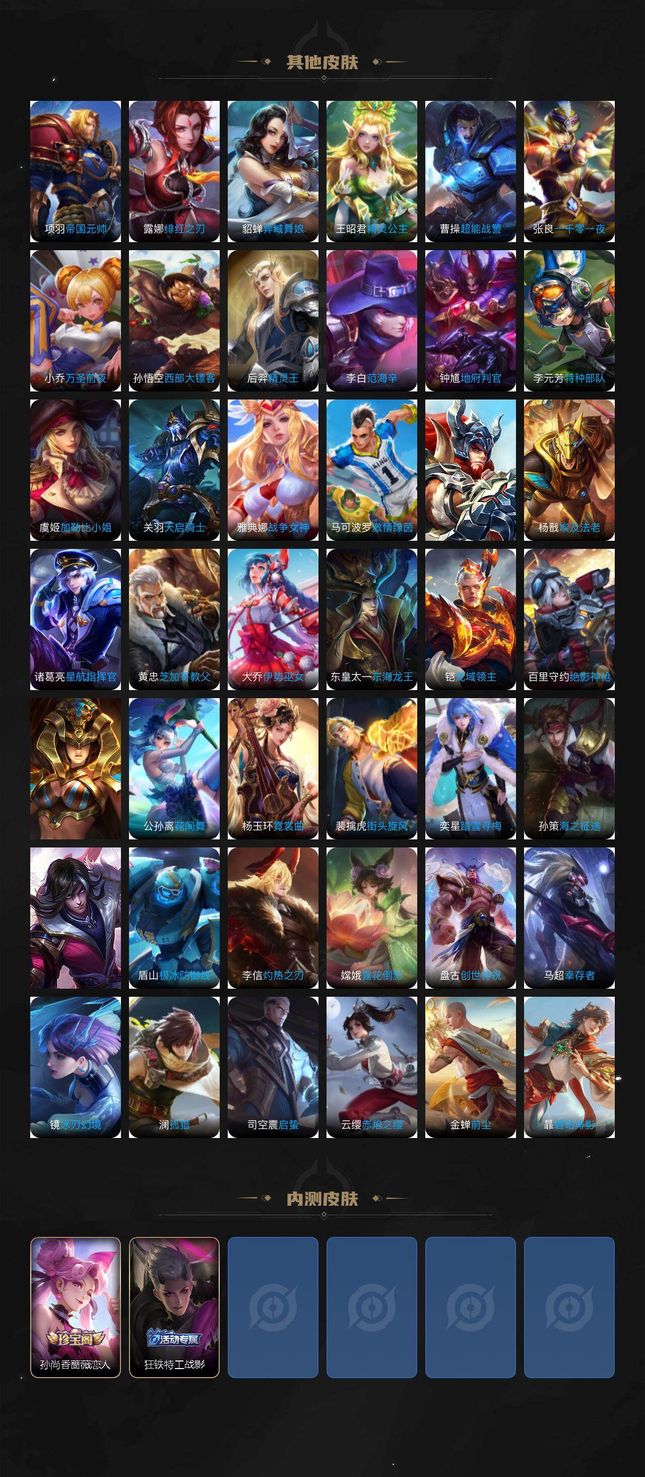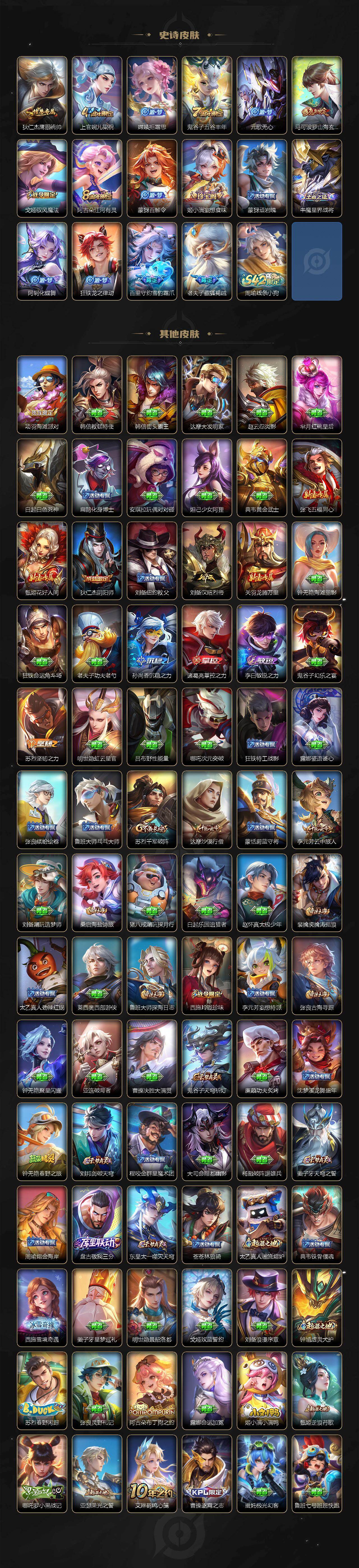 【传说皮肤】:后羿神树通天,妲己愿照众生和,澜愿照九州拓,云缨幻光神枪,桑启鸣野蒿,露娜霜月吟,孙悟空齐天大圣,裴擒虎寅虎赤拳,梦奇胖达荣荣