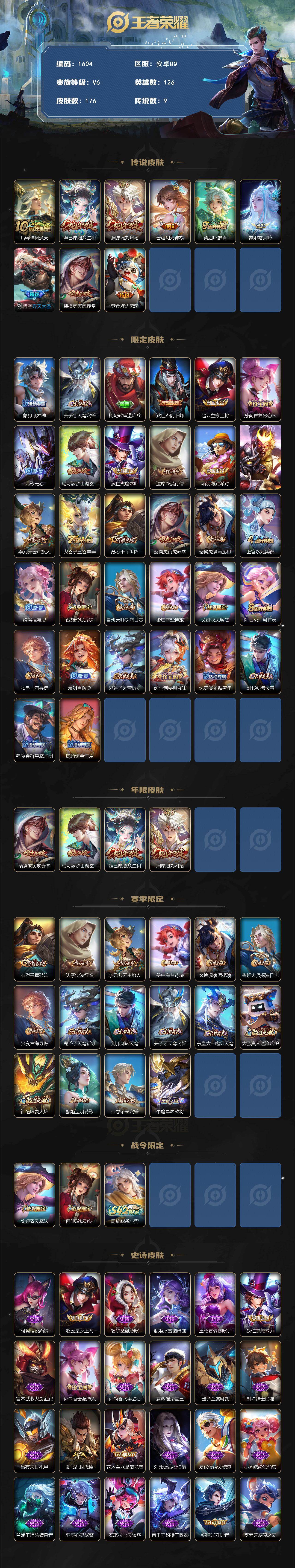 【176皮9传说 澜愿照九州拓 孙悟空齐天大圣 露娜霜月吟 裴擒虎寅虎赤拳】安卓Q-V6-永恒钻石II段位-126英雄-176皮肤-9传说-40史诗