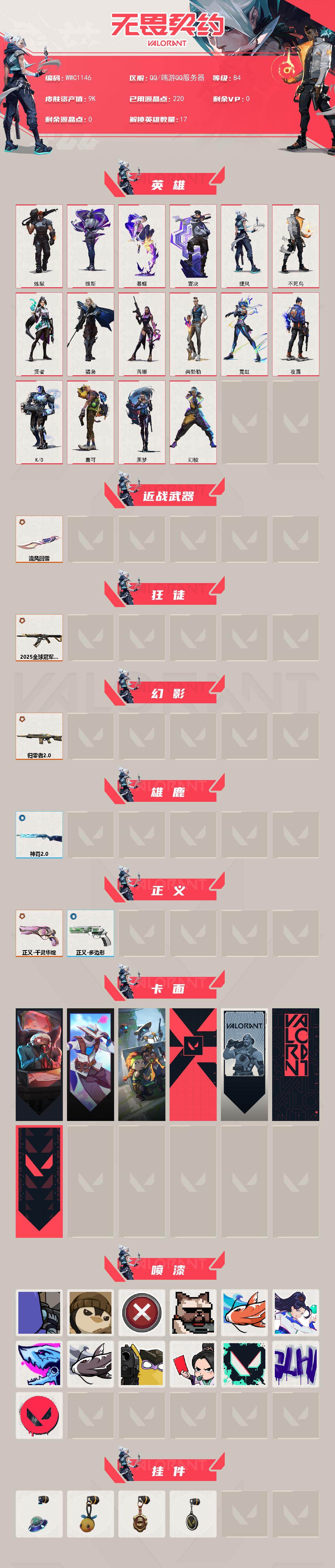 【WWC1146】终极*4/皮肤*7/等级*84/段位:白银/幻棱/炼狱/维斯/暮蝶/壹决/捷风/不死鸟/贤者/猎枭/芮娜/尚勃勒/霓虹/夜露/K/O/盖可/黑梦/近战武器-流风回雪/狂徒-2025全球冠军赛/幻影-归零者//2.0/雄鹿-神罚//2.0/正义-千灵华绽/正义-多边形/生意人麦宝 卡面/无畏契约GO!第一卷:零 卡面/别冒尖 卡面/代号红色 卡面/新兵报到 卡面/V契约 卡面/无畏契约 卡面/他们将落荒而逃 喷漆/通缉:战术企鹅 喷漆/买装还是存钱 喷漆/关门放狗 喷漆/红鳞 喷
