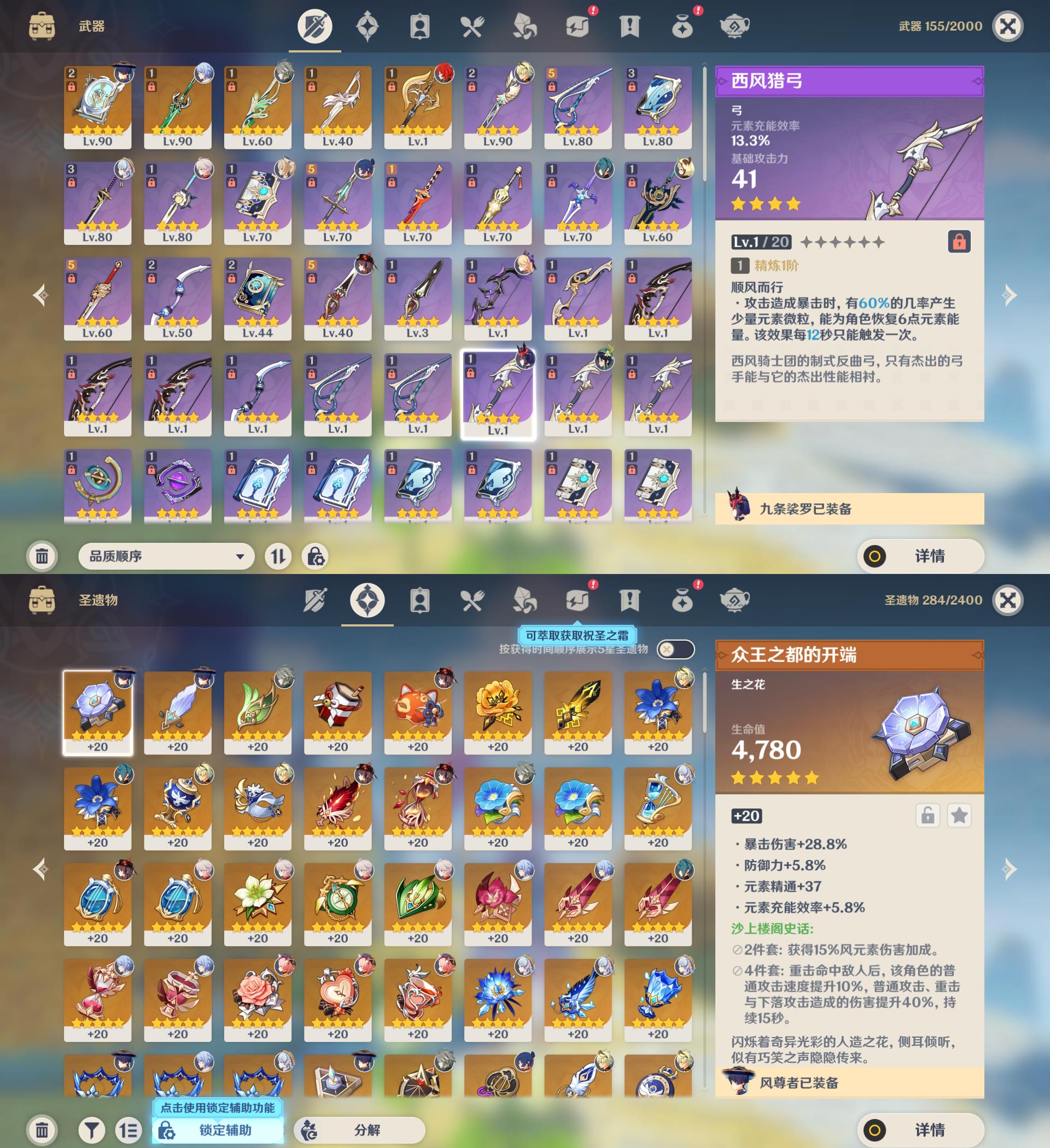 【YS1194】57级/17黄/女主/9个五星角色/5个五星武器/神里绫华/神里绫人/枫原万叶/莫娜/温迪/胡桃/2命迪卢克/艾尔海森/七七/精2四风原典/磐岩结绿/裁叶萃光/风鹰剑/裁断