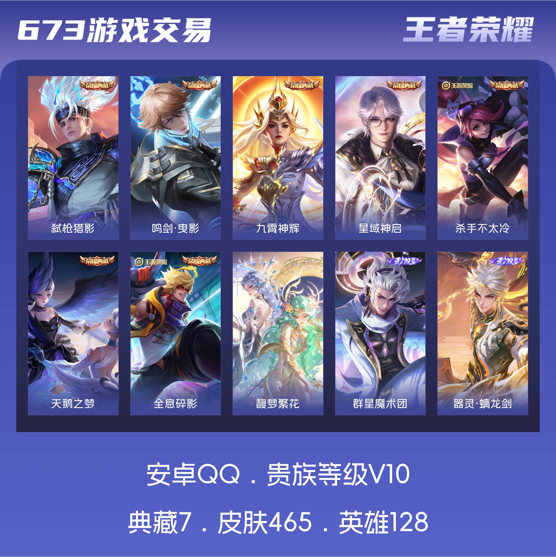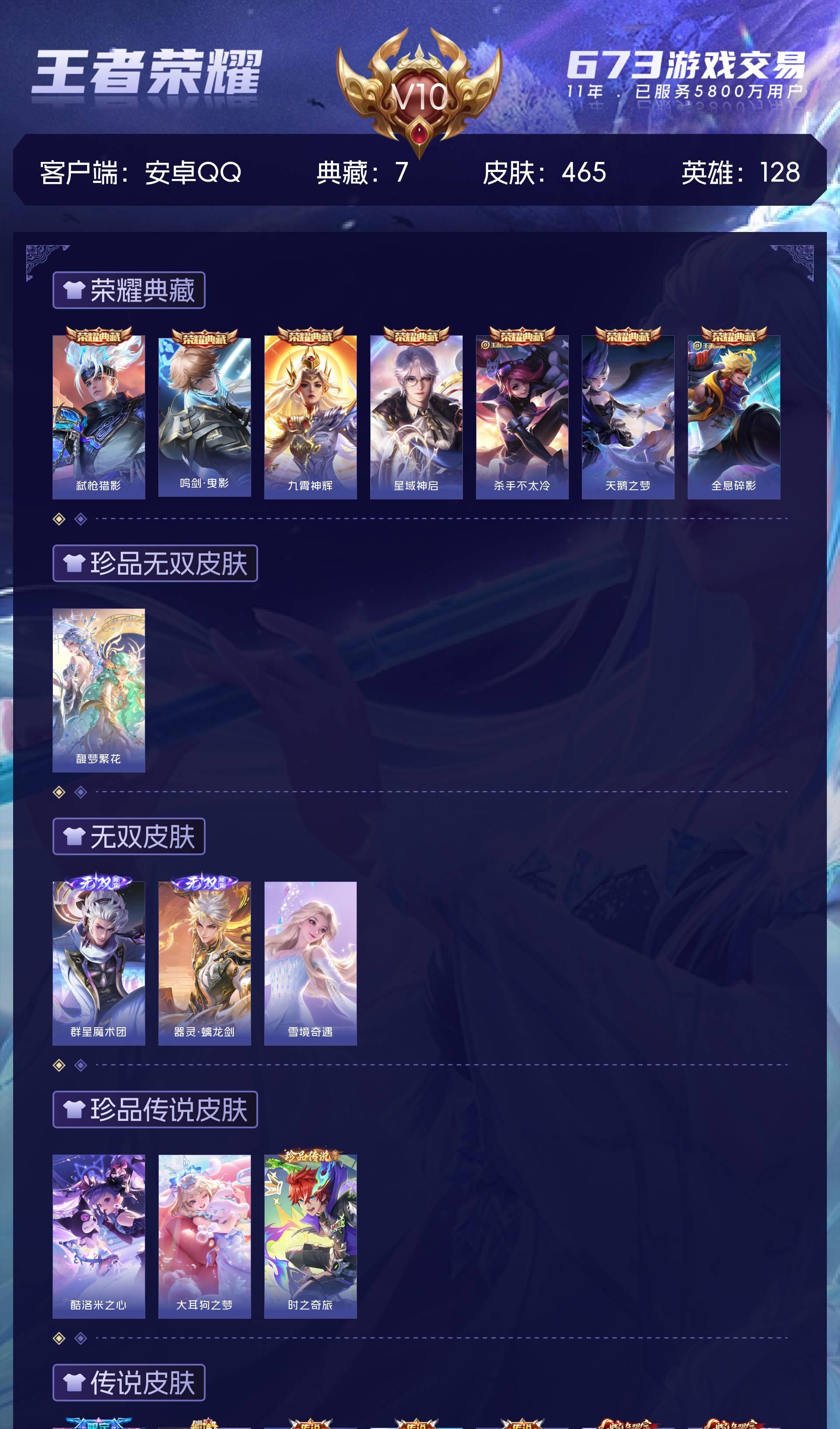 V10 皮肤465 英雄128 永恒钻石 荣耀典藏7 珍品无双1 无双皮肤3 珍品传说3 传说53 其他皮肤405