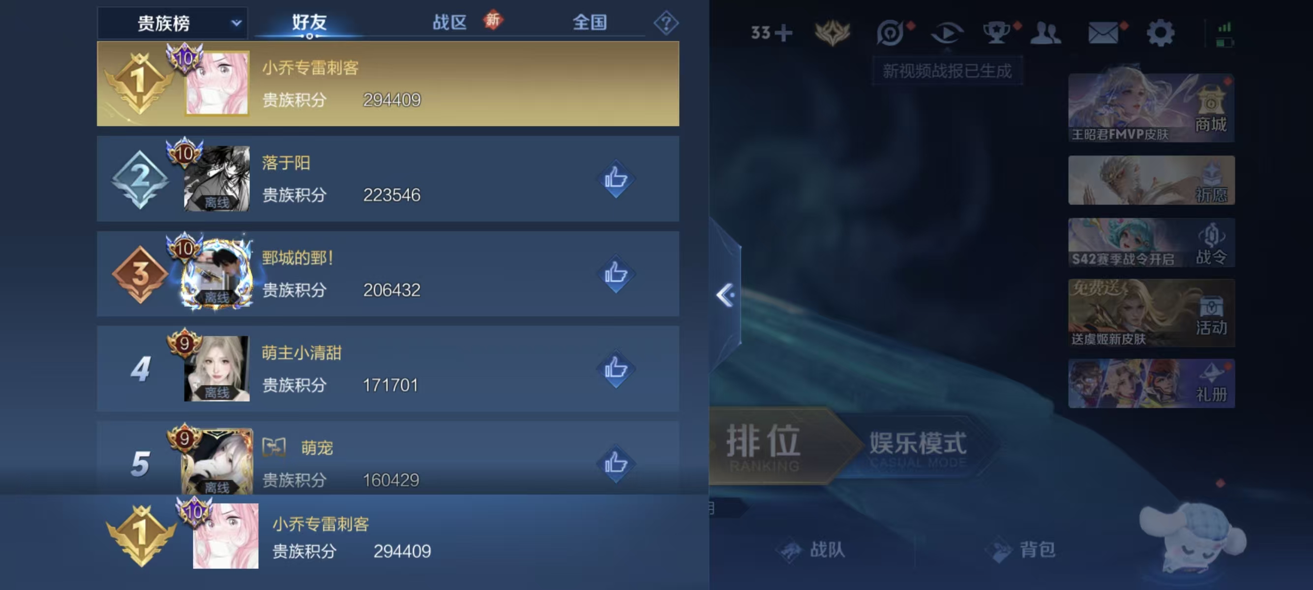 【王者荣耀】用户273*****e