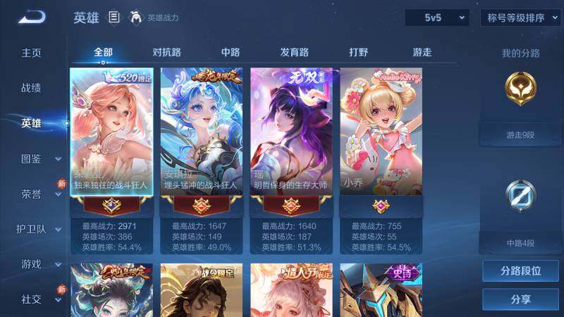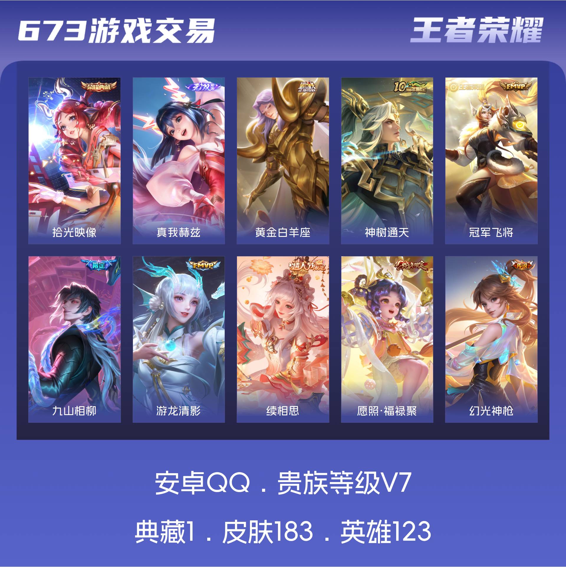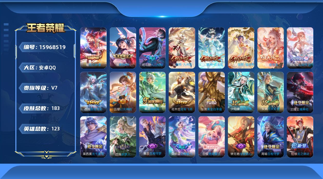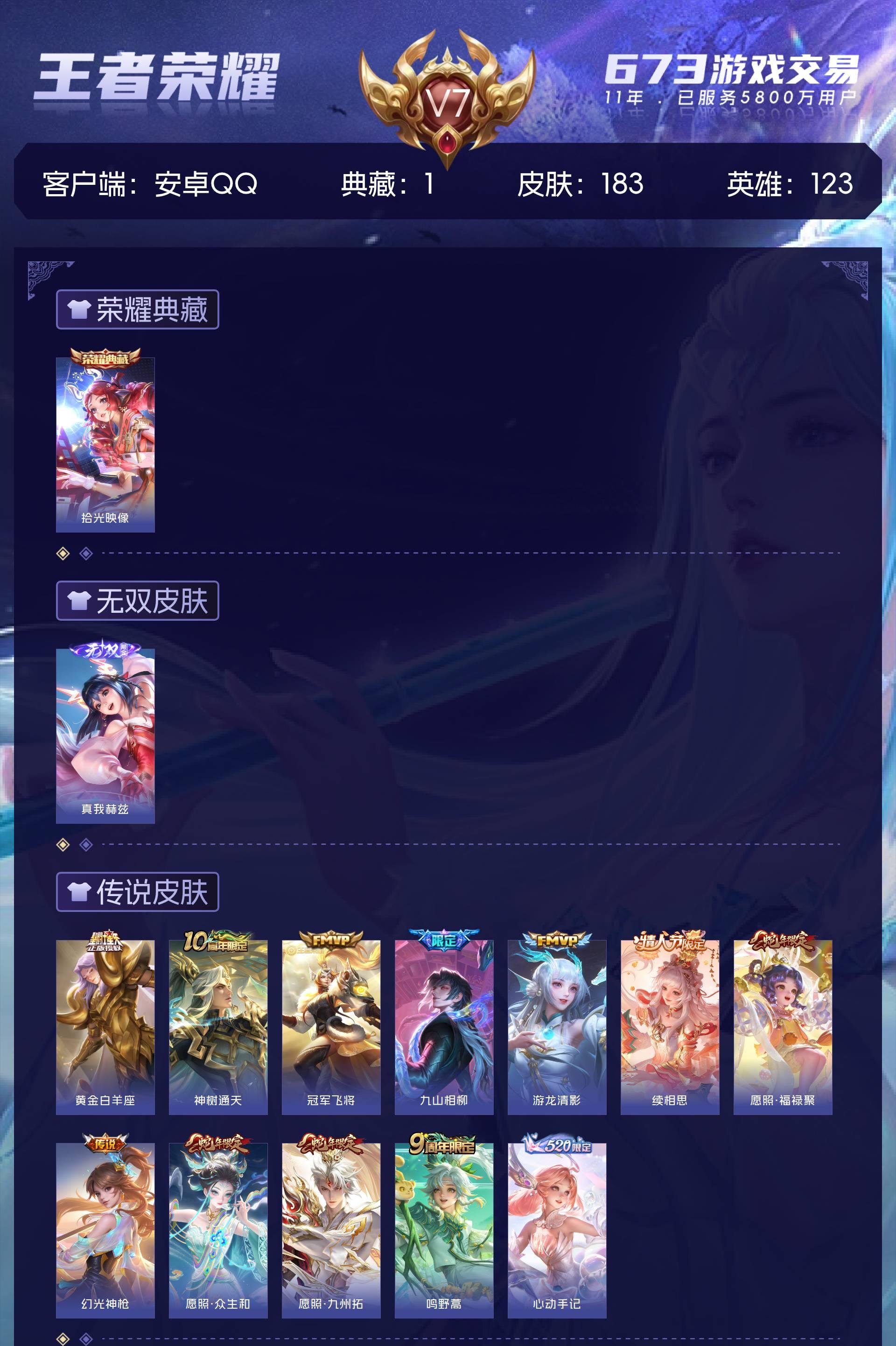 安卓Q-V7-荣耀黄金II段位-123英雄-183皮肤-1典藏皮肤-1无双-12传说-58史诗